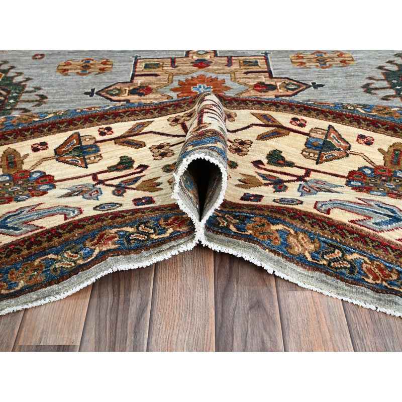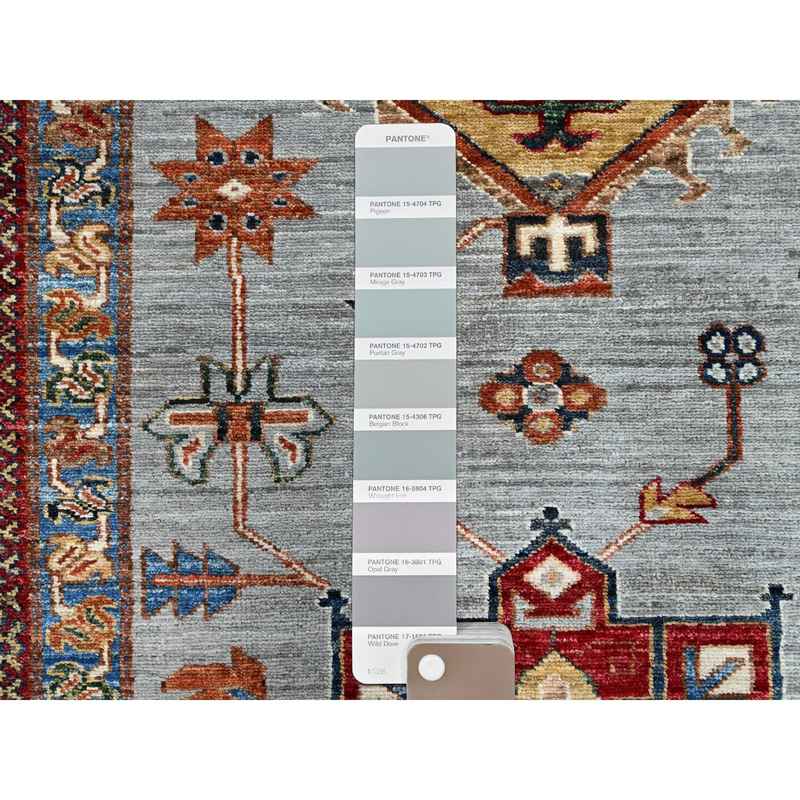 10’3″x13’8″ Dark Pewter Gray and Nuance White, Vegetable Dyes, Denser Weave Vegetable Dyes, Organic Wool, Hand Knotted Afghan Super Kazak, Karajeh Design with All Over Geometric Medallions, Oriental Rug Sh86711