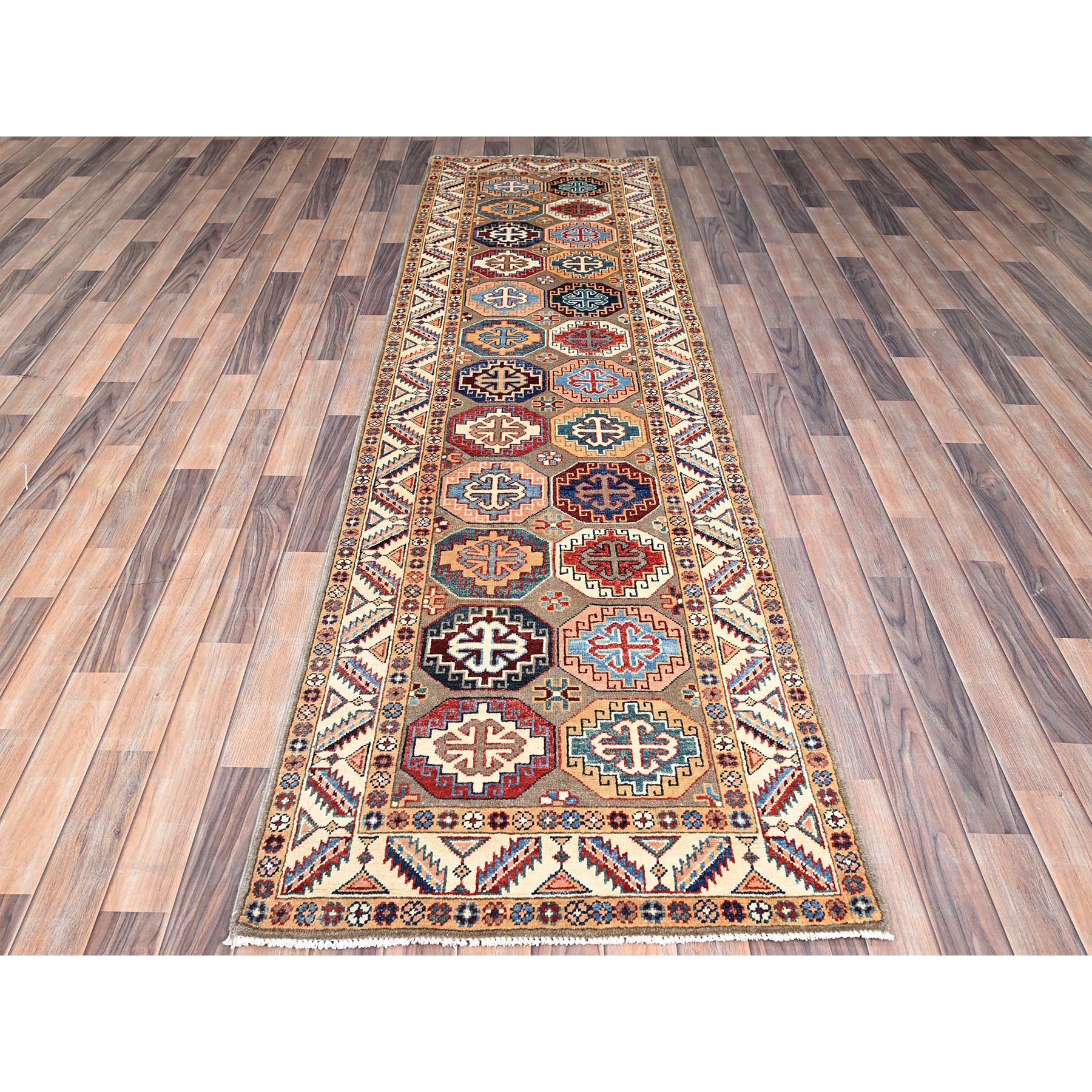 2’10″x9’9″ Laurel Oak Gray, Hand Knotted Densely Woven Special Kazak With All Over Colorful Geometric Motifs, Pure Wool, Vegetable Dyes, Wide Runner Oriental Rug Sh86249