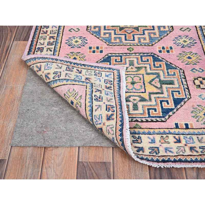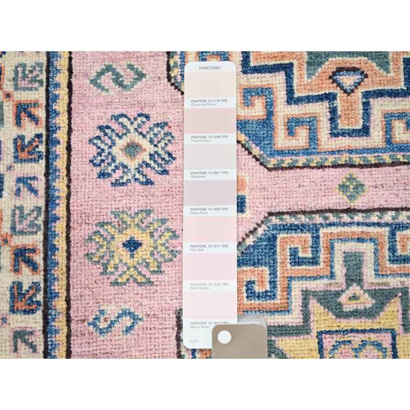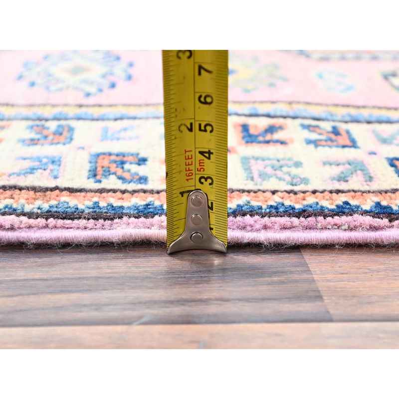 2’7″x9’7″ Mary’s Rose Pink with Ivory Border, Kazak Geometric Medallions Hand Knotted, Vegetable Dyes and Dense Weave, Runner Natural Wool Oriental Rug Sh86287