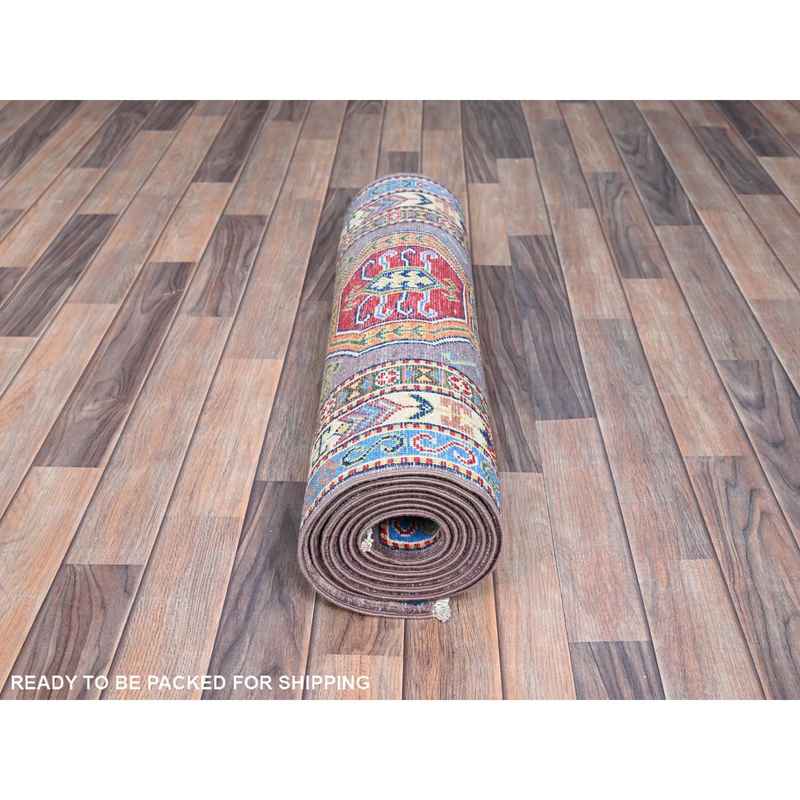 2’8″x10’Moonscape Gray With Daisy White Border, Kazak, Natural Dyes, Organic Wool, Densely Woven, Tribal Patterns, Oriental Runner Hand Knotted Rug Sh86851