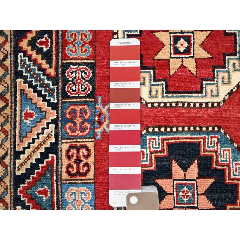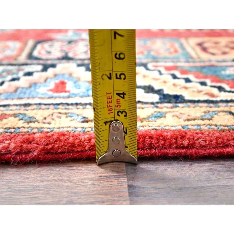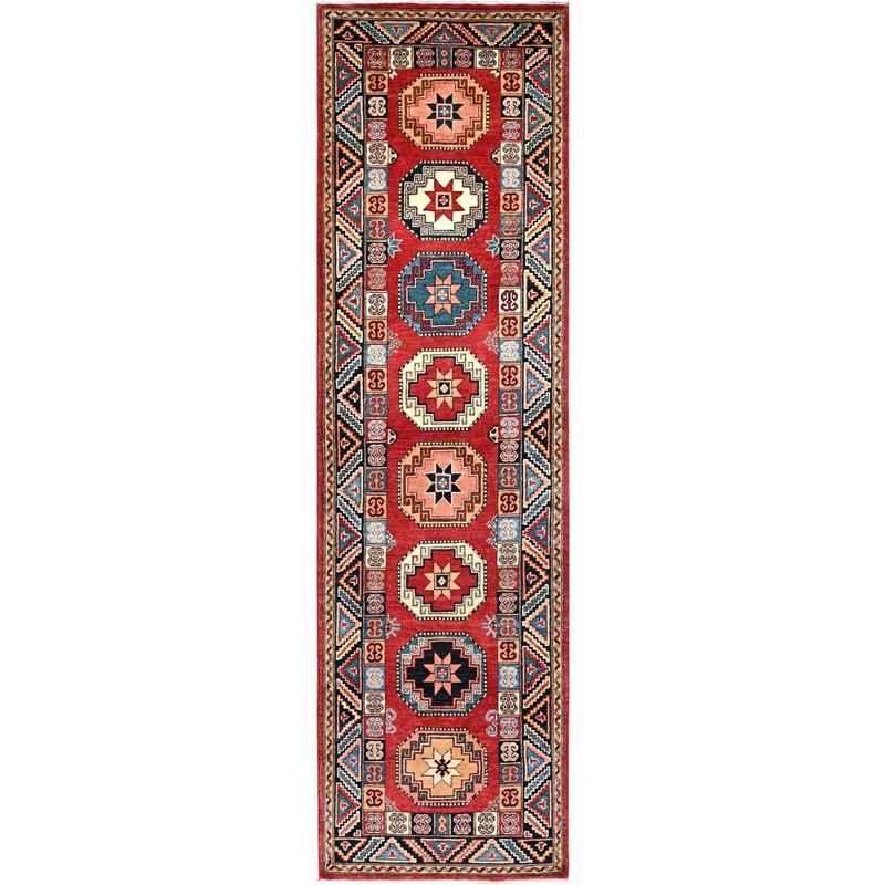 2’8″x9’9″ Bolero Red and Delft Blue, Special Kazak with Colorful Geometric Medallions, Natural Dyes, 100% Wool, Hand Knotted, Runner Oriental Rug Sh86449