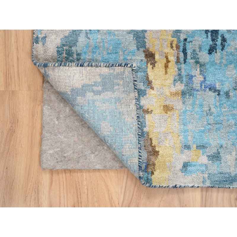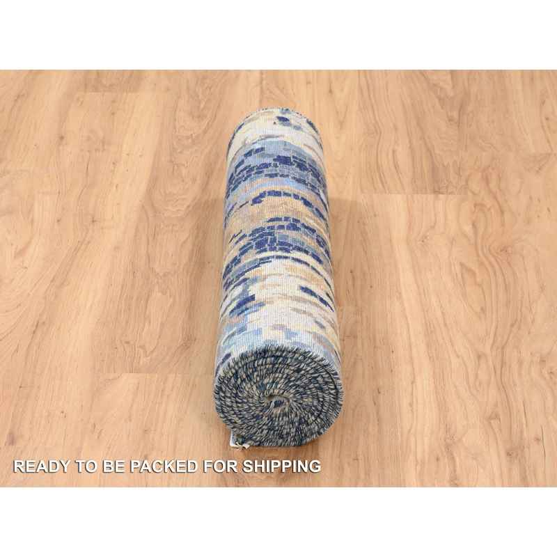 2’8″x9’9″ Denim Blue with Mix of Gold, Hand Knotted, Mosaic Design Wool and Silk, Runner Persian Knot Oriental Rug Sh63910