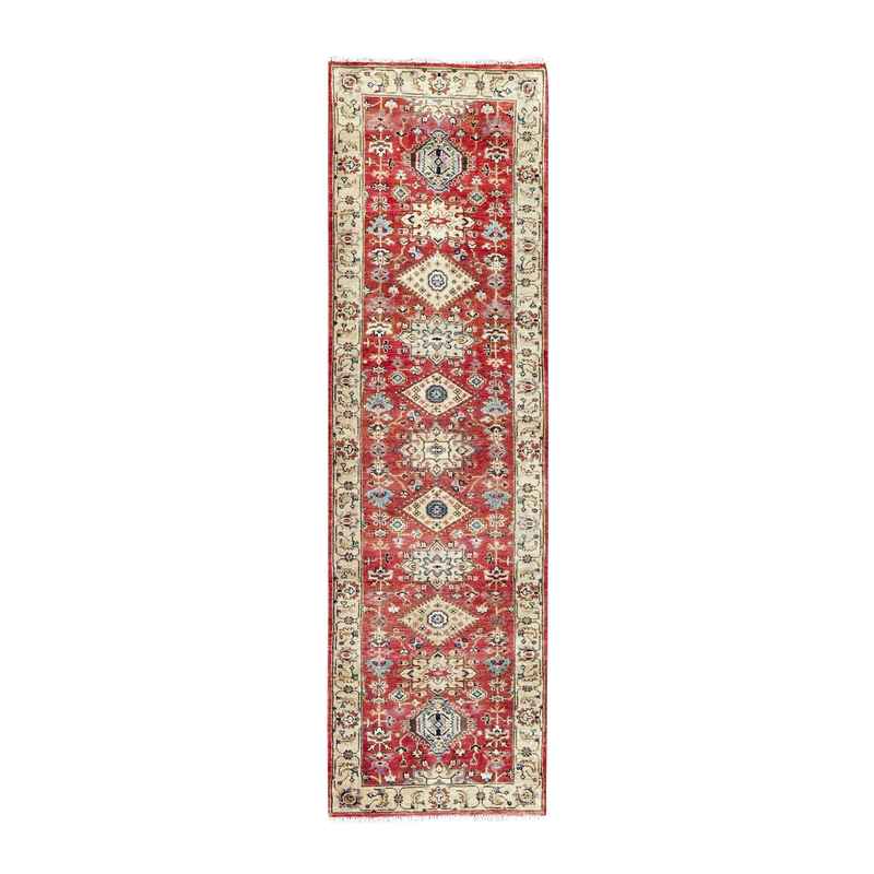 2’9″x10′ Crimson Red, Hand Knotted, Organic Wool, Karajeh Design, Soft to the Touch Pile, Runner Oriental Rug Sh84653