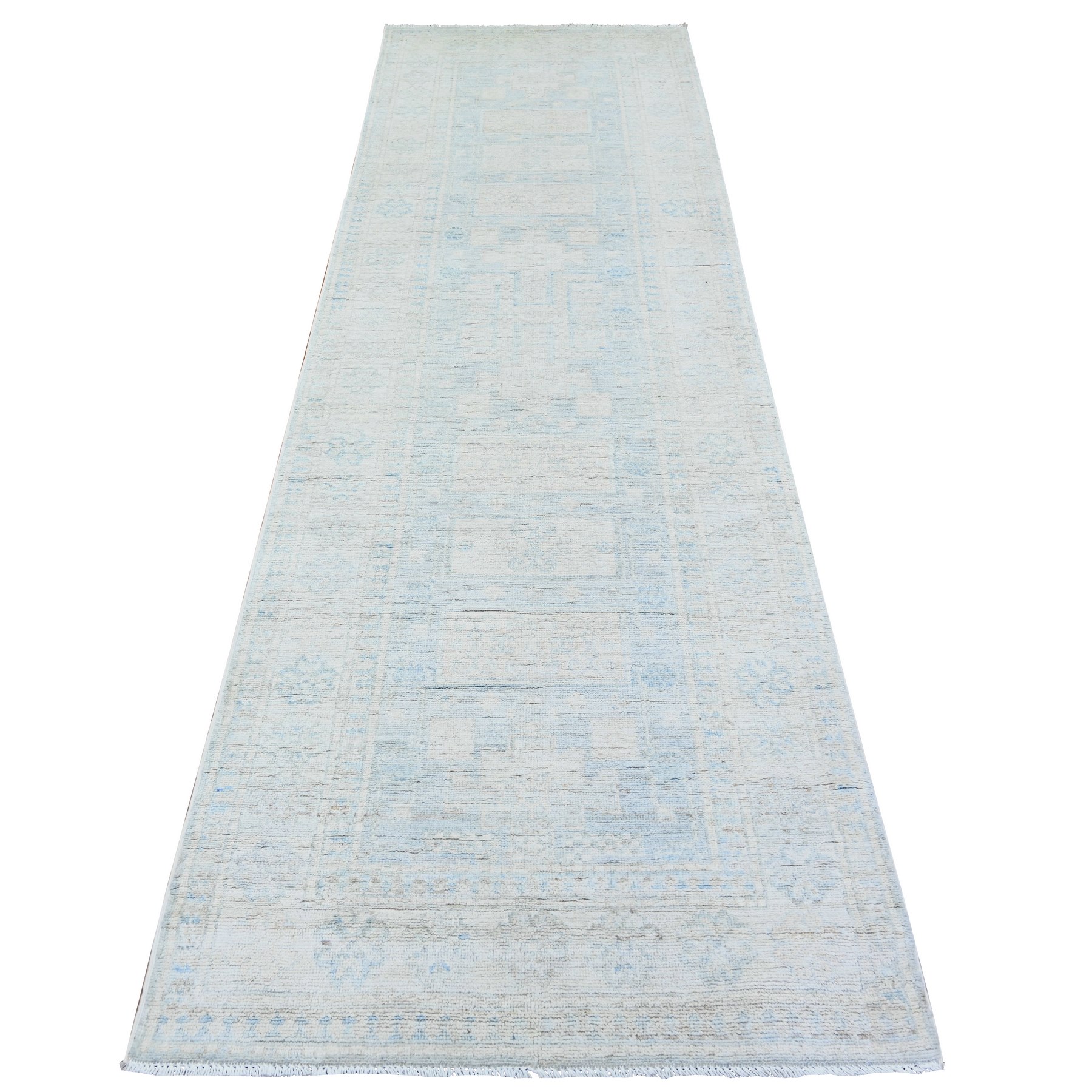 3’1″x10′ Spanish Gray with Lexicon Ivory, High Grade Wool, Vegetable Dyes, Peshawar Washed Out Faded Designs, Hand Knotted, Runner Oriental Rug Sh74959
