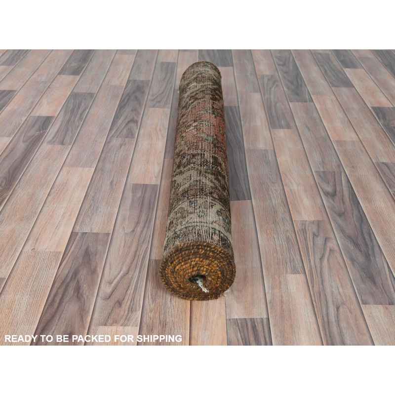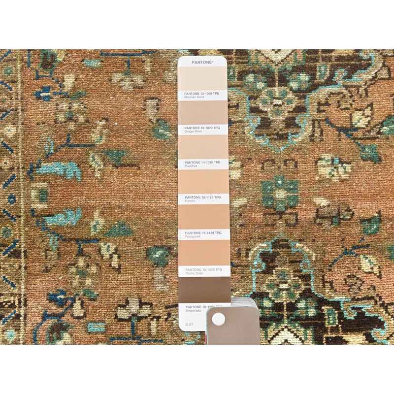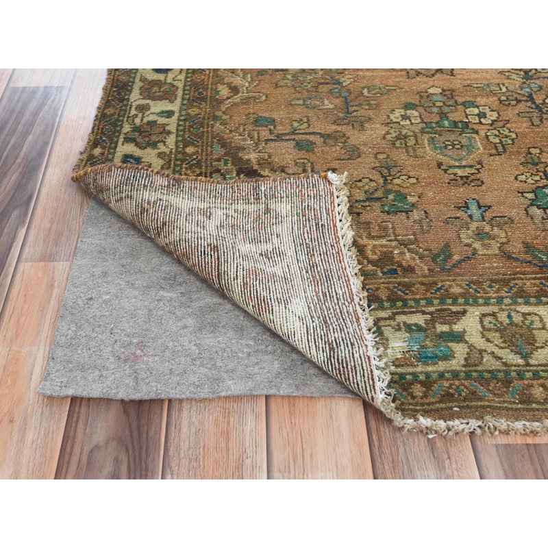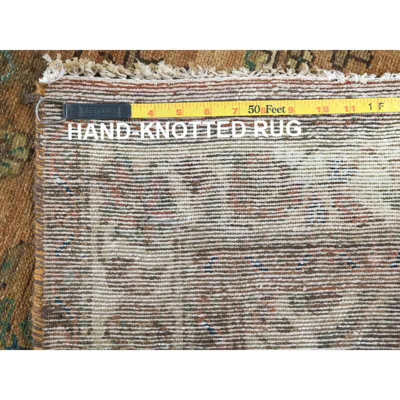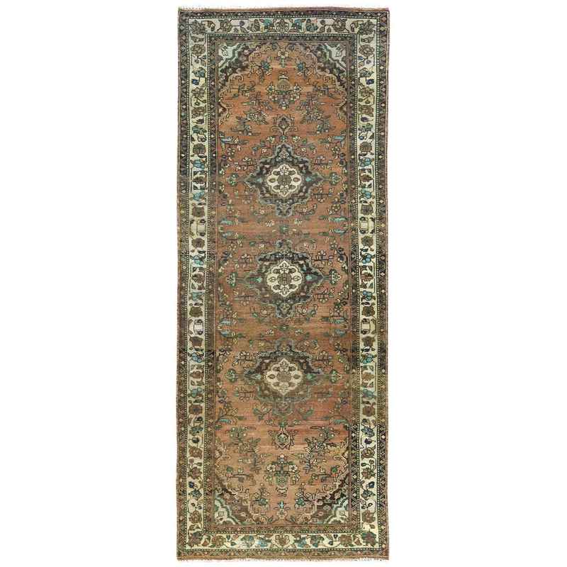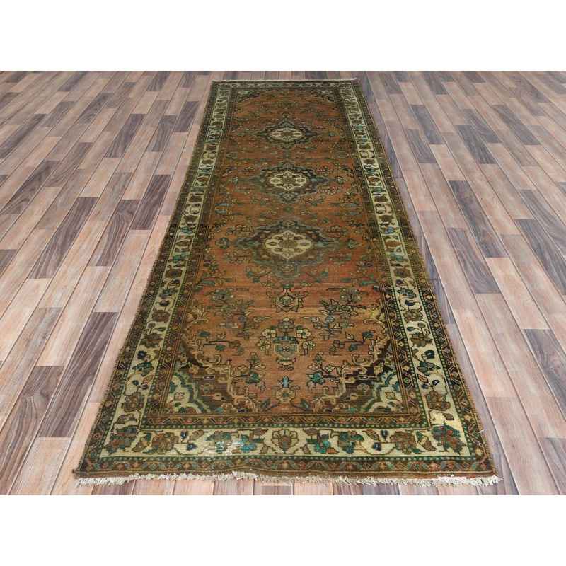 3’3″x9’8″ Honey Brown with Touches of Green, Vintage Persian Hamadan, Hand Knotted, Pure Wool, Distressed Look, Worn Down Wide Runner Oriental Rug Sh81649