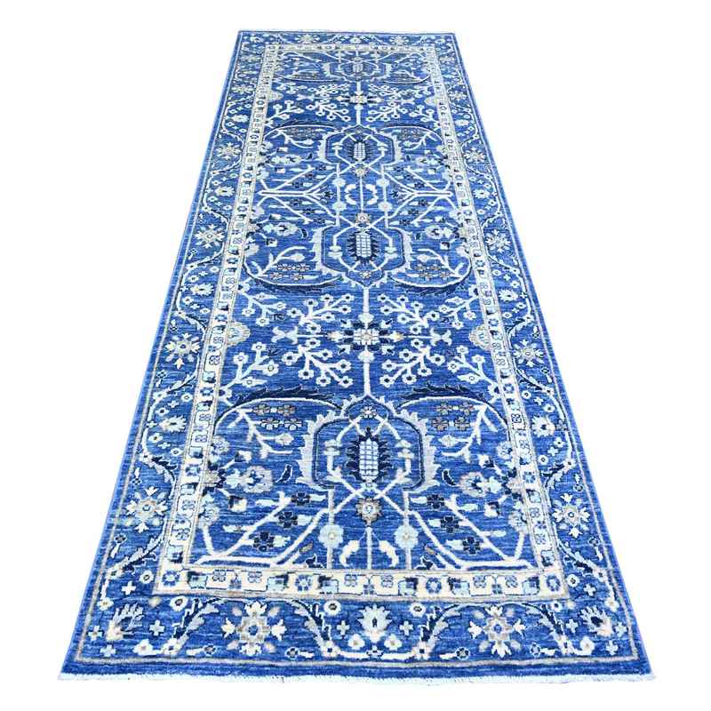 3’7″x10′ Sapphire Blue, Vegetable Dyes, Densely Woven, Fine Peshawar with Heriz Design, Natural Wool, Hand Knotted, Wide Runner Oriental Rug Sh74542