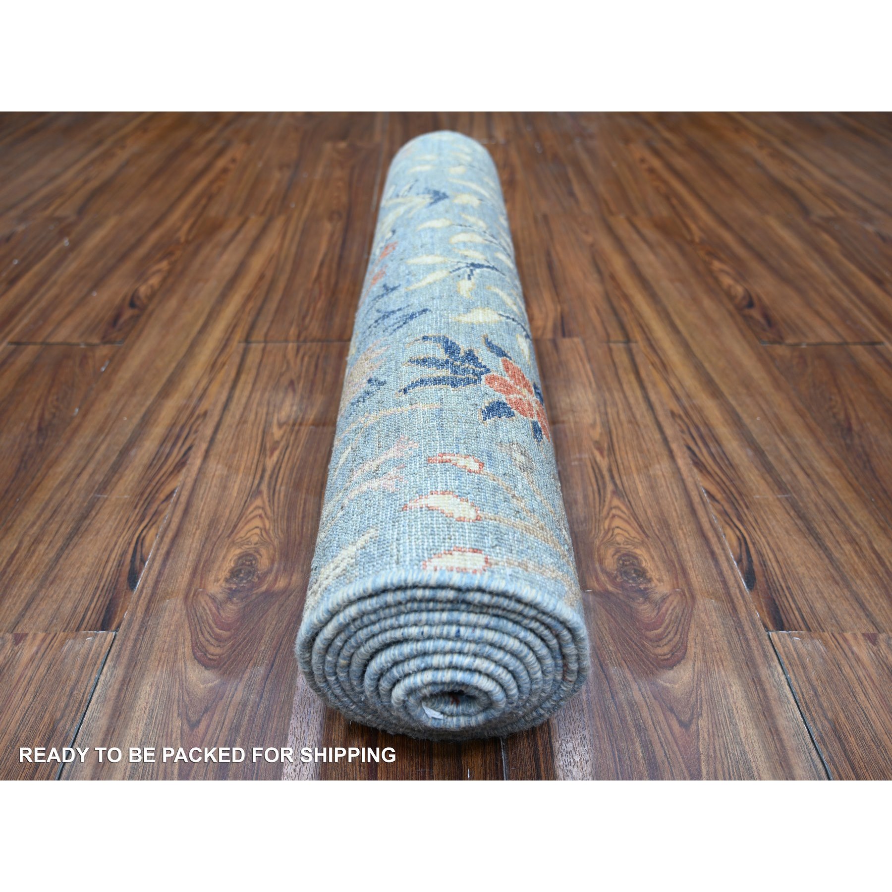 3’x10’2″ Glaucous Blue, Afghan Peshawar with Birds of Paradise Design, Pure Wool, Hand Knotted, Natural Dyes, Runner Oriental Rug Sh74422