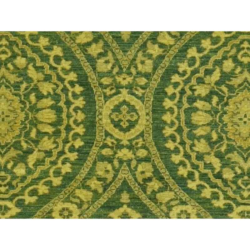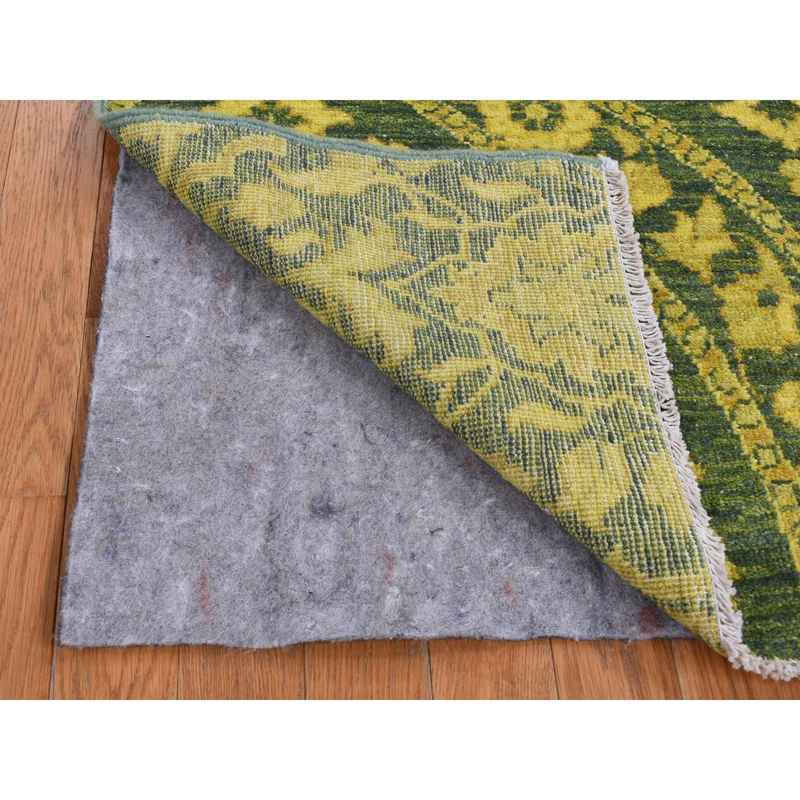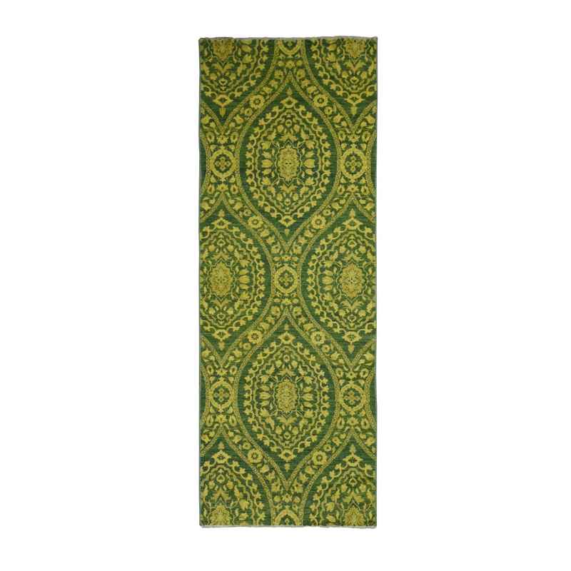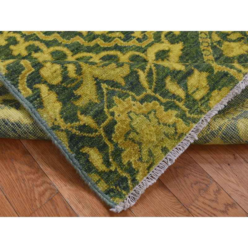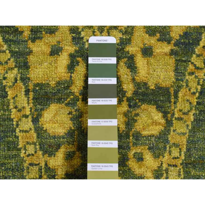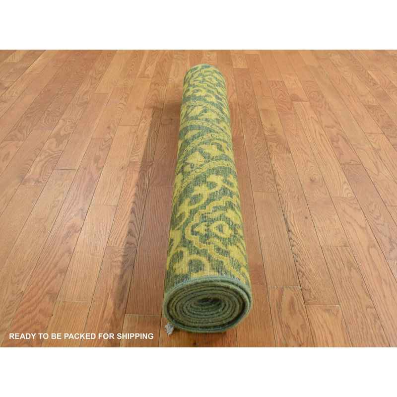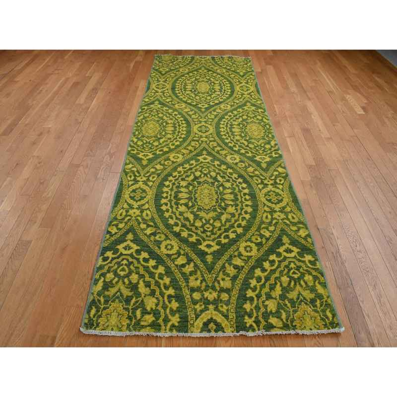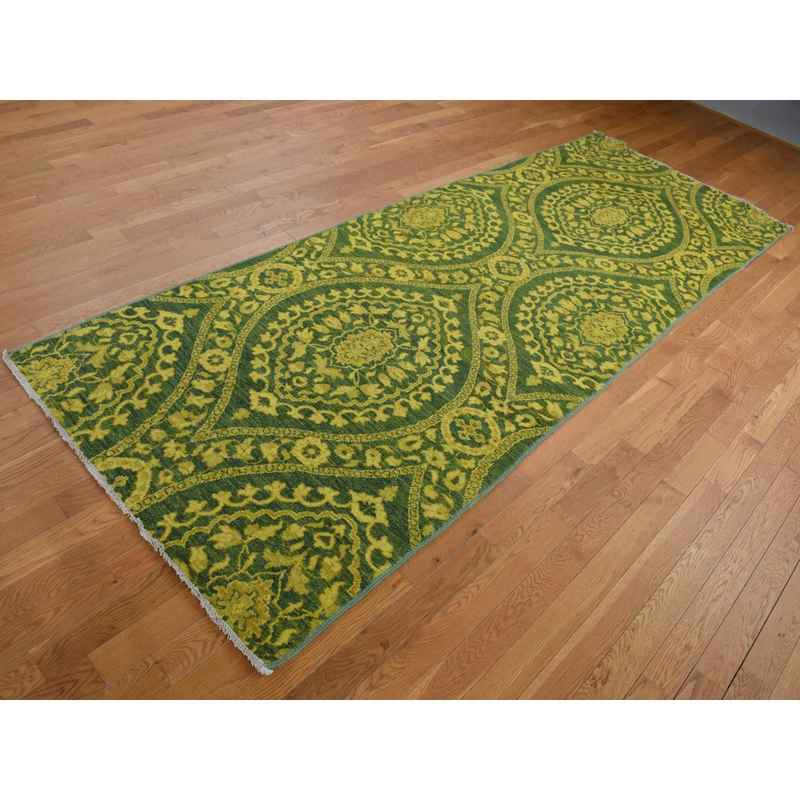 4’1″x11’8″ Green Overdyed, Mughal Design, Tone on Tone, Peshawar Hand Knotted, Pure Wool, Wide Runner Oriental Rug Sh87693