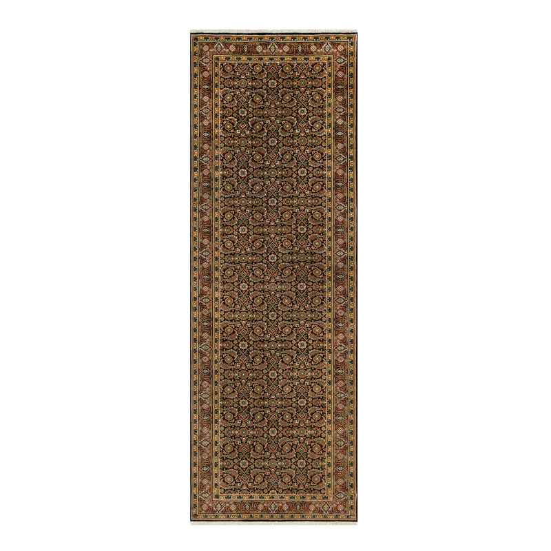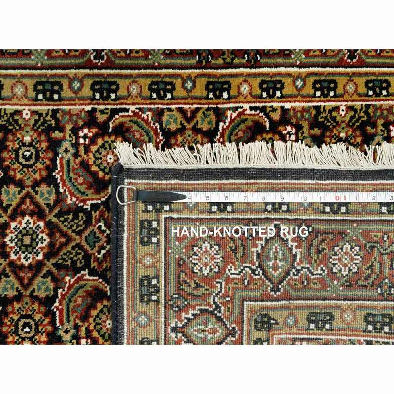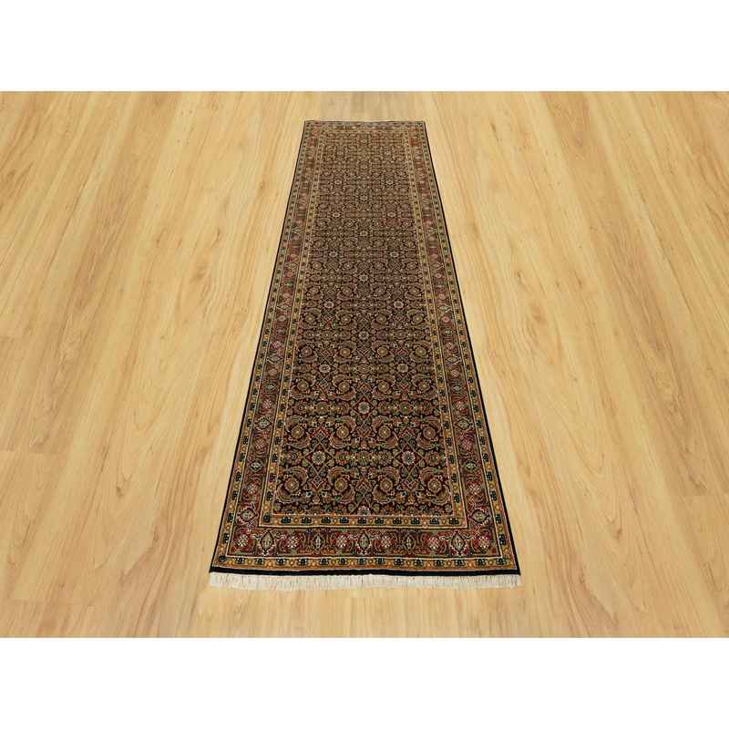 4’x11’9″ Jet Black with Bay Red, All Over Fish Mahi Herati Design, Natural Wool, Hand Knotted, Wide Runner Oriental Rug Sh90440