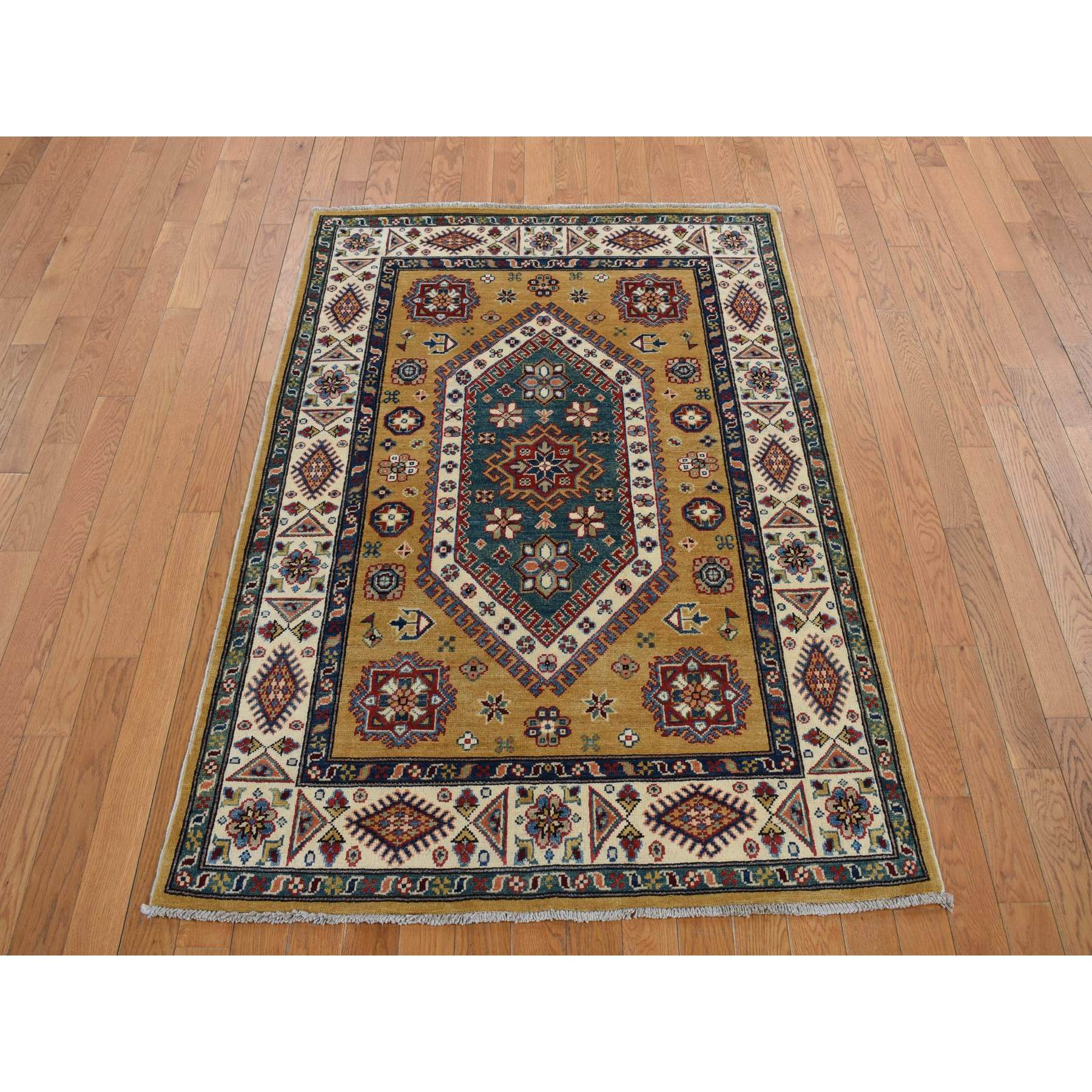 4’x5’7″ Goldenrod Color, Hand Knotted, Shiny Wool, Special Kazak, Geometric Pattern, Oriental Rug Sh78115