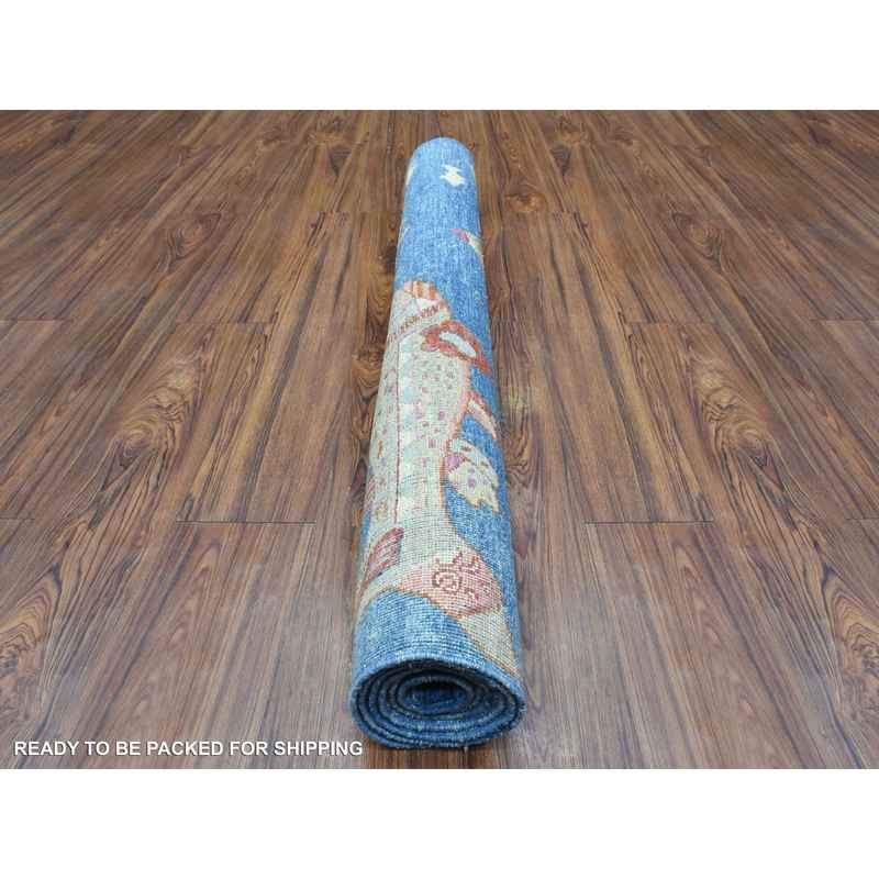4’x5’8″ Sapphire Blue, Organic Wool Hand Knotted, Afghan Peshawar with Colorful Oceanic Fish Design, Dense Weave Vegetable Dyes, Oriental Rug Sh73019