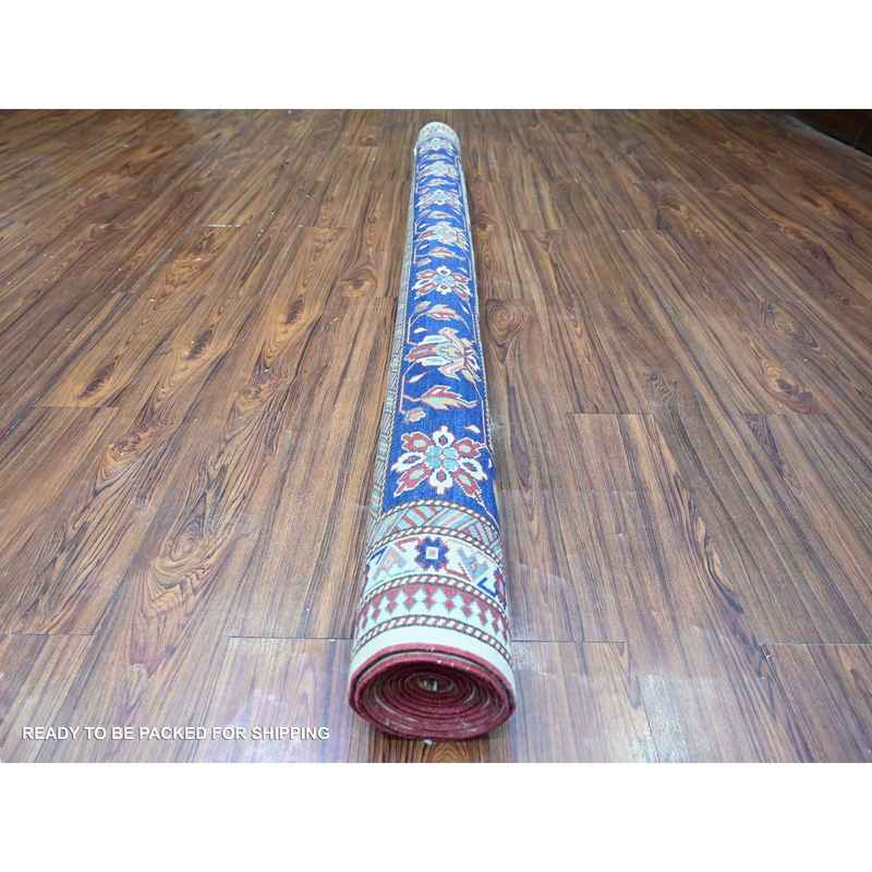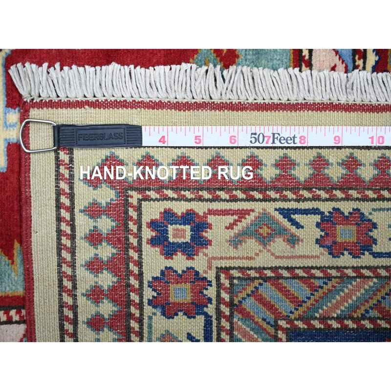 6’9″x9’4″ Feather White with Cobalt Blue, Natural Dyes, Hand Knotted, Afghan Super Kazak with Tribal Medallion Design, Pure Wool, Oriental Rug Sh74922