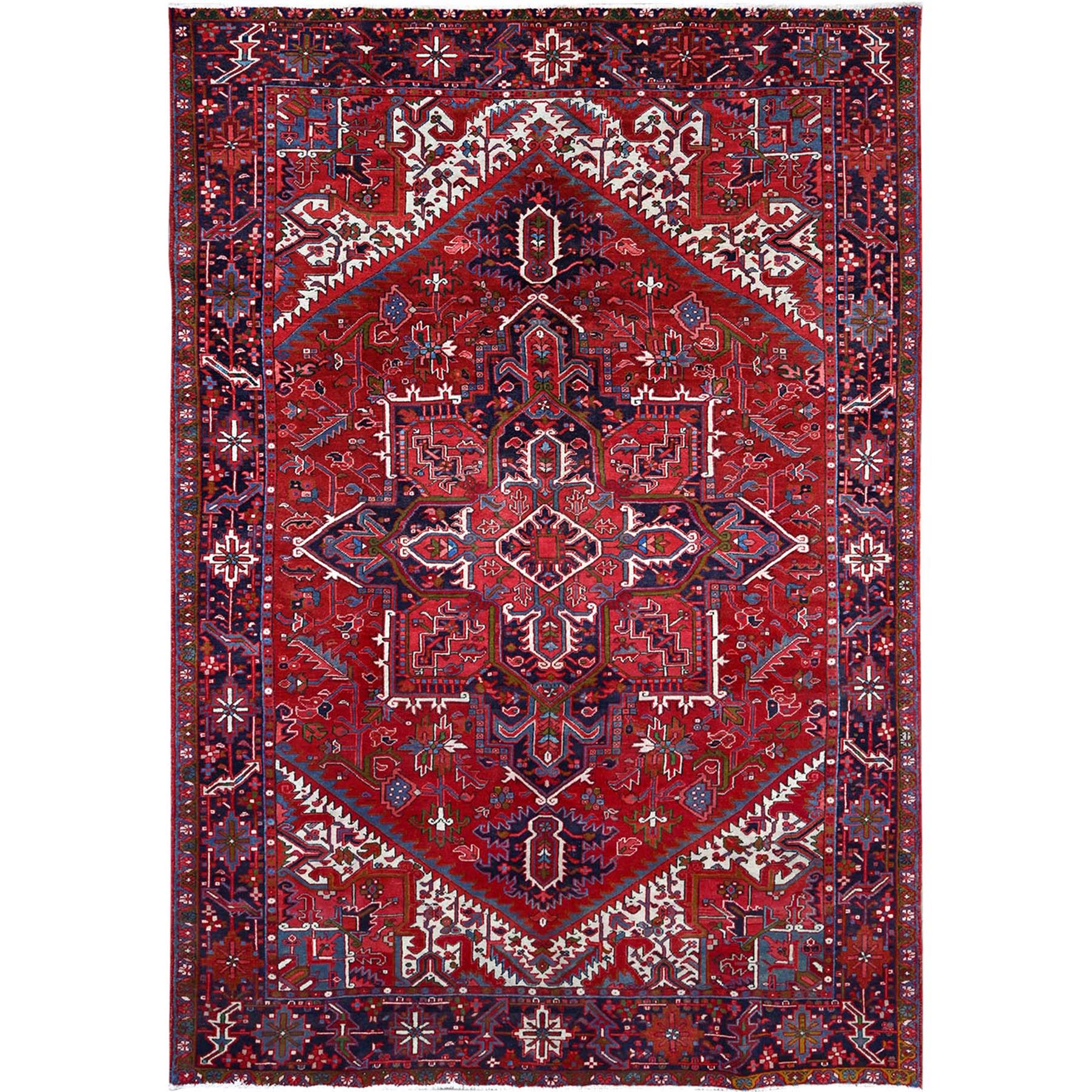 7’8″x11′ Pepper Red and Yale Blue Border, Hand Knotted Cropped Thin, Even Wear Old Geometric Persian Heriz, Sides and Ends Professionally Secured and Cleaned, Soft Wool Oriental Rug Sh103