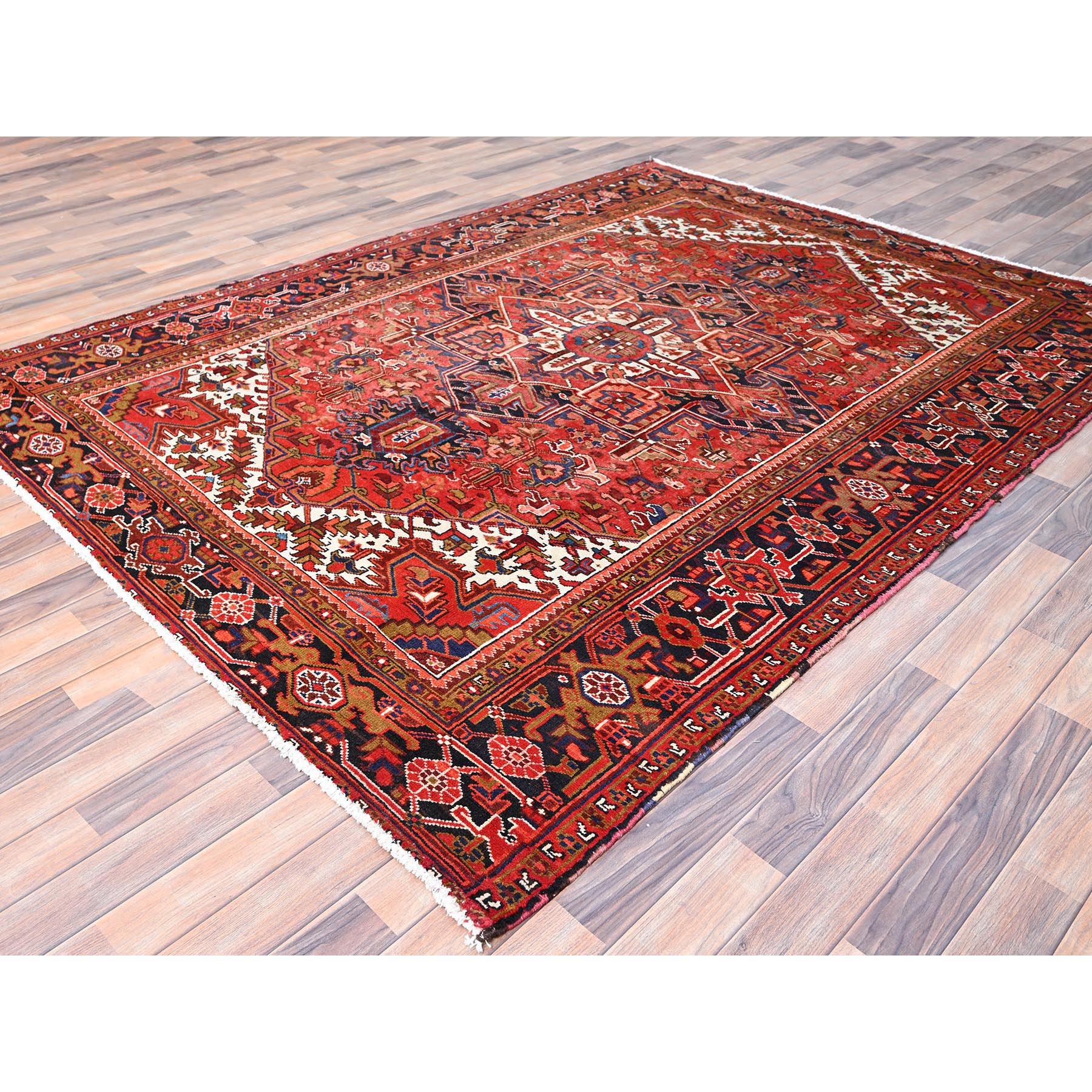 7’x9’1″ Scarlet Red, Semi Antique Natural Wool Persian Heriz Large central Geometric Motifs, Good Condition, Sides and Ends Professionally Secured, Cleaned, Oriental Rug Sh85901