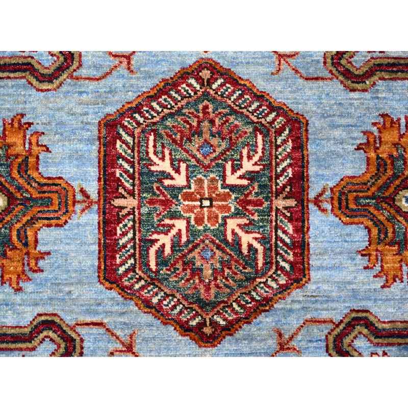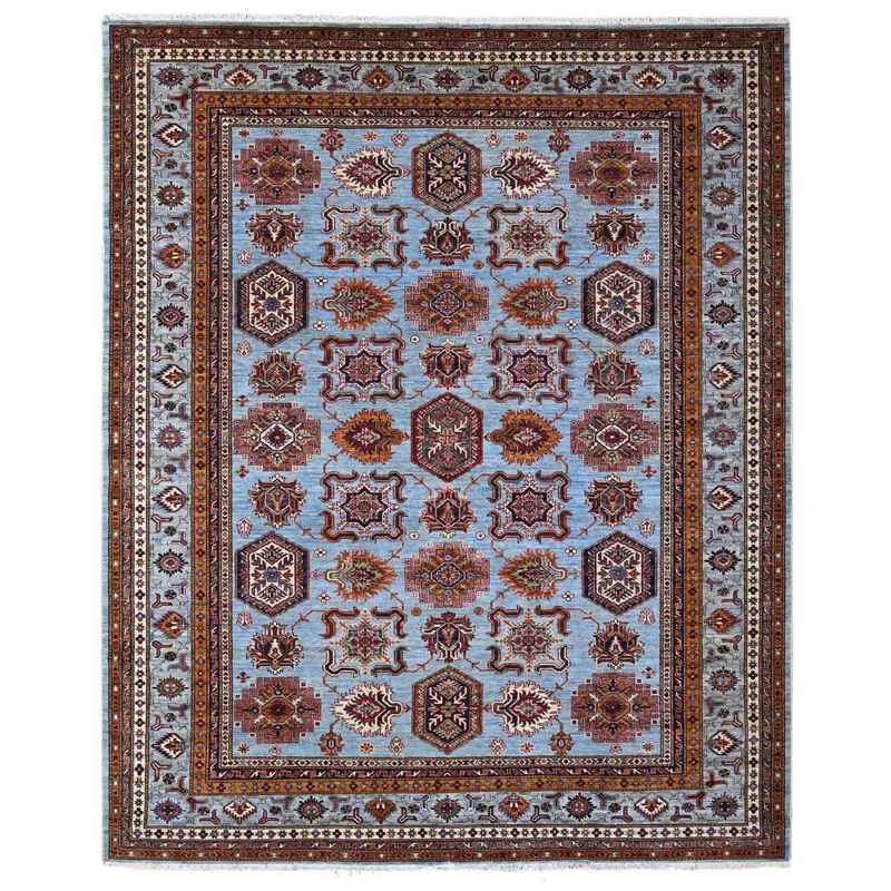 8’3″x9’8″ Lagoon Blue, Afghan Super Kazak With All Over Motifs, Vegetable Dyes, Hand Knotted, Soft and Vibrant Wool, Oriental Rug Sh88913