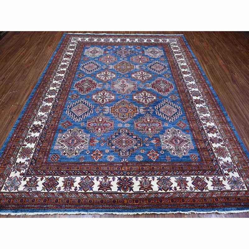 8’x10′ Atlantic Blue, Afghan Super Kazak, Hand Knotted, 100% Wool, All Over Tribal Medallions, Vegetable Dyes, Oriental Rug Sh88914
