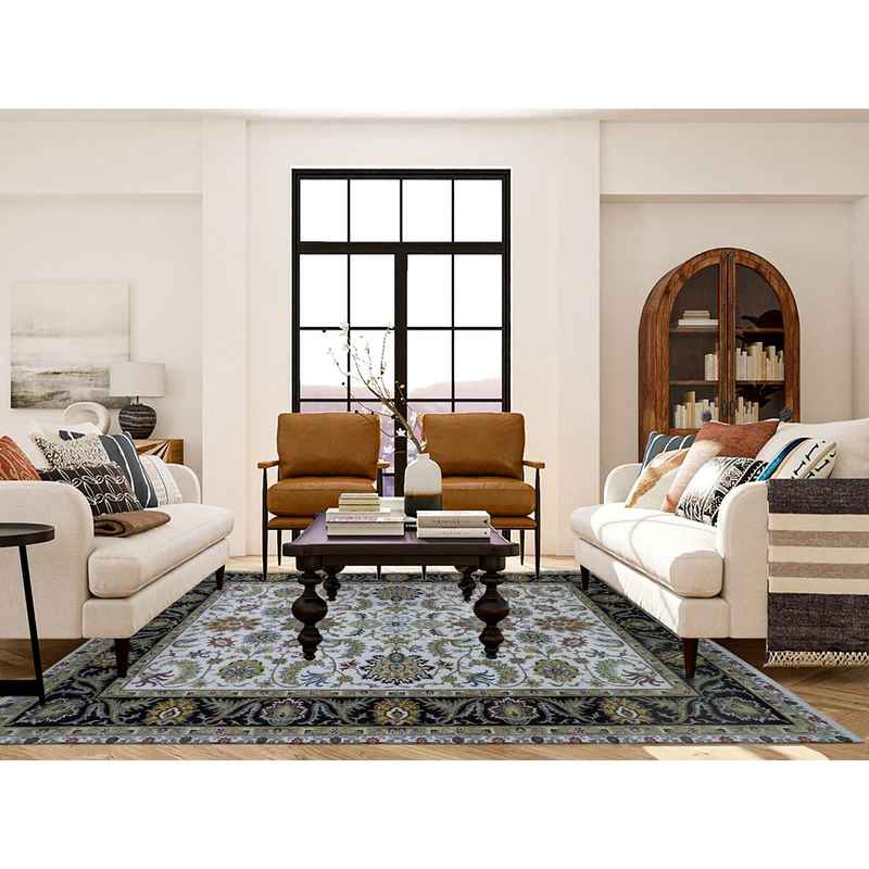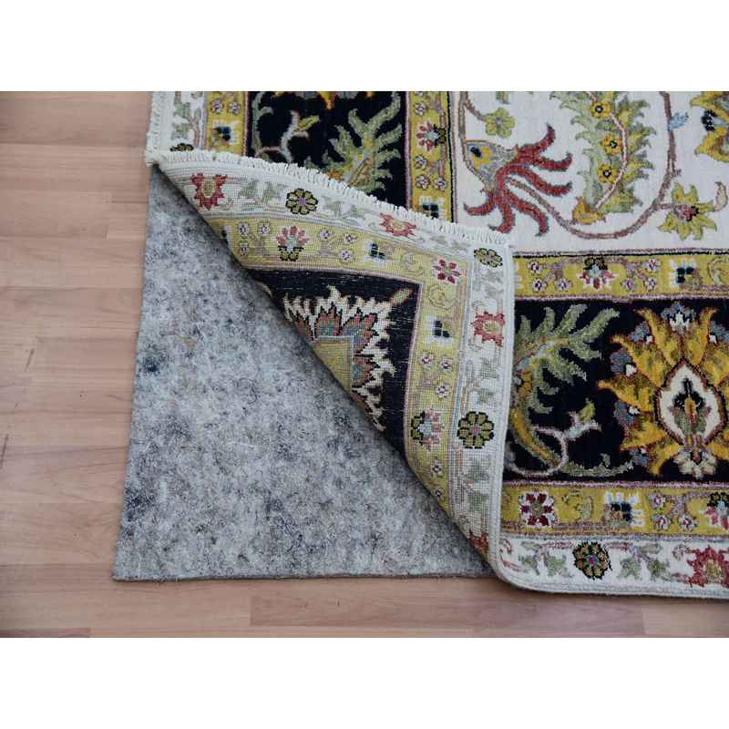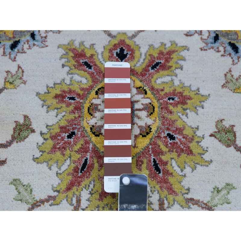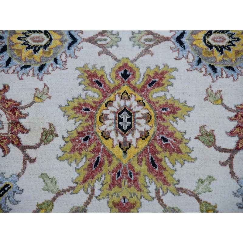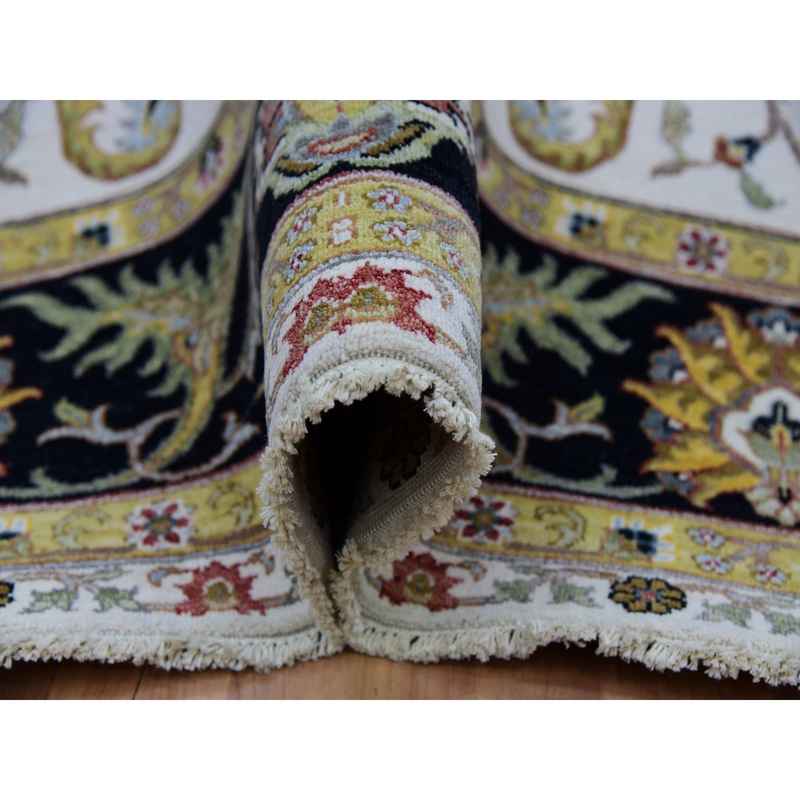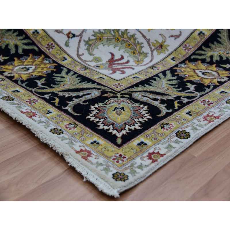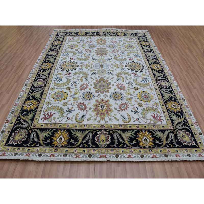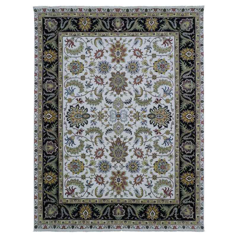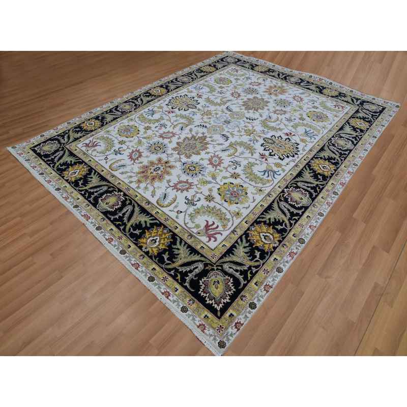 8’x10’1″ Eider White With Tricorn Black Border, Hand Knotted All Wool, Agra With Scroll and Large Leaf Design, Natural Dyes, Oriental Rug Sh83114