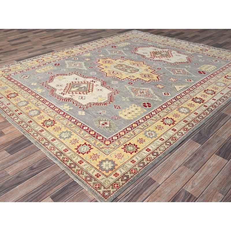 8’x9’9″ Alfalfa Gray With Cornsilk White, Hand Knotted Kazak Geometric Motifs Design 100% Wool, Densely Woven With Vegetable Dyes, Oriental Rug Sh86783