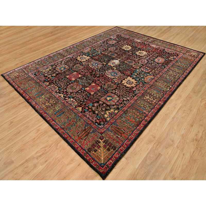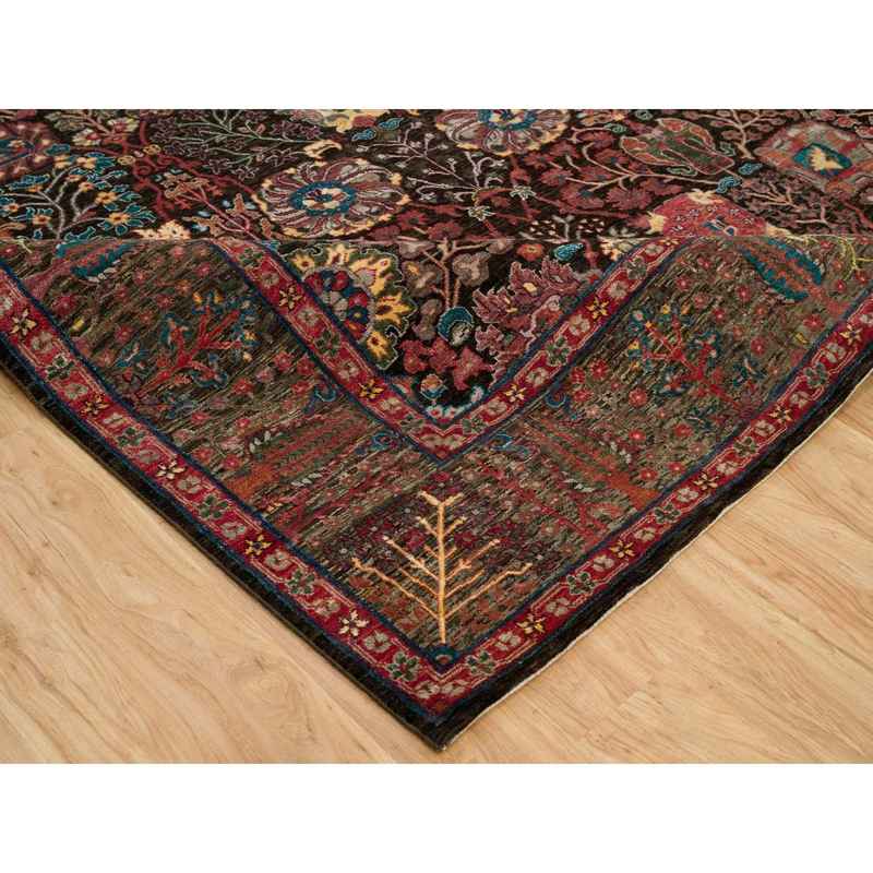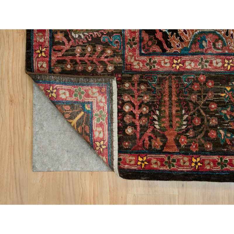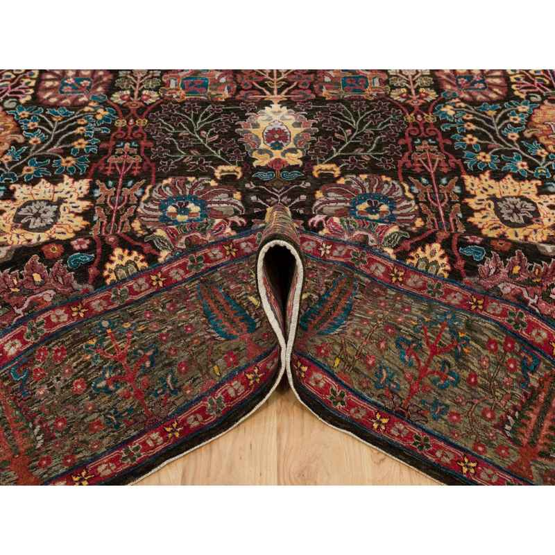9’1″x12′ Obsidian Black with Ecru Brown, Tabriz Wool and Silk Vase Design, Fine Hand Knotted Oriental Rug Sh90223