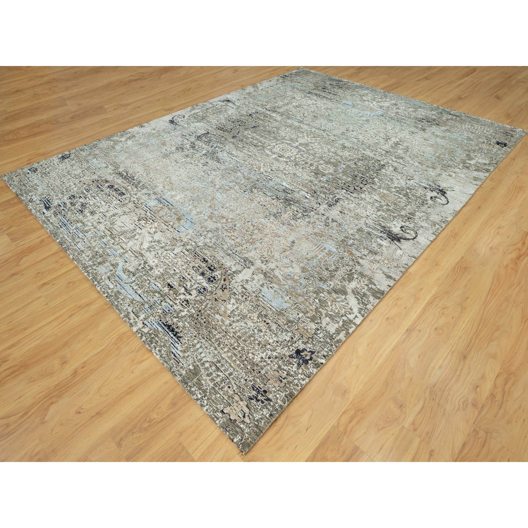 9’1″x12’2″ Fossil Gray, Borderless, Hand Knotted Silk with Textured Wool, Modern Transitional Persian Influence Erased Medallion Design, Oriental Rug Sh90698