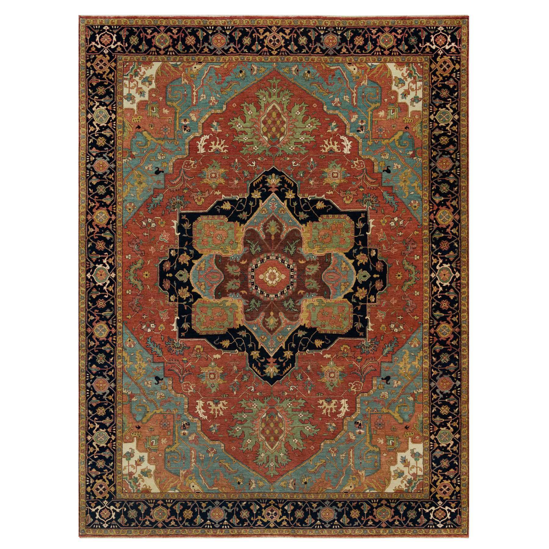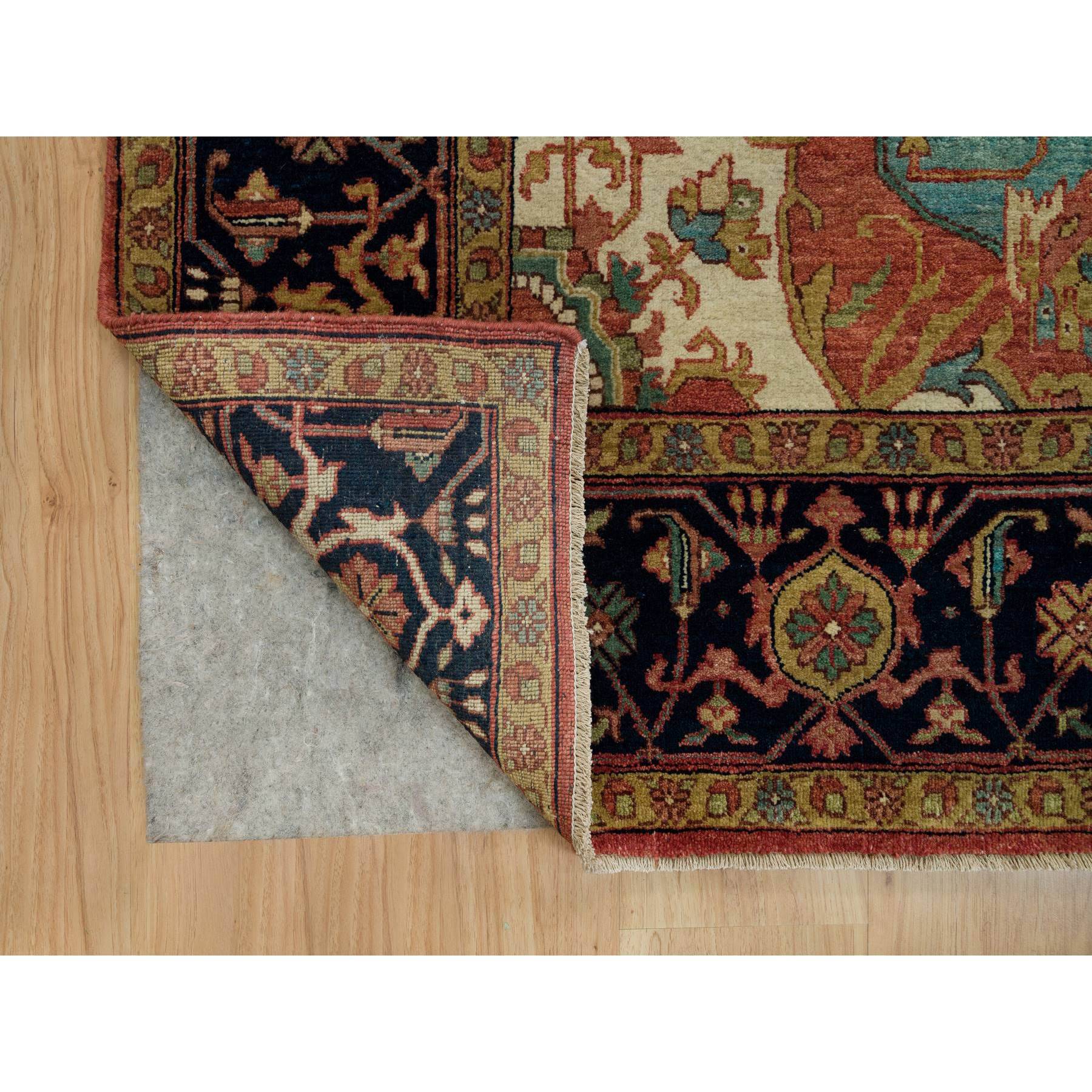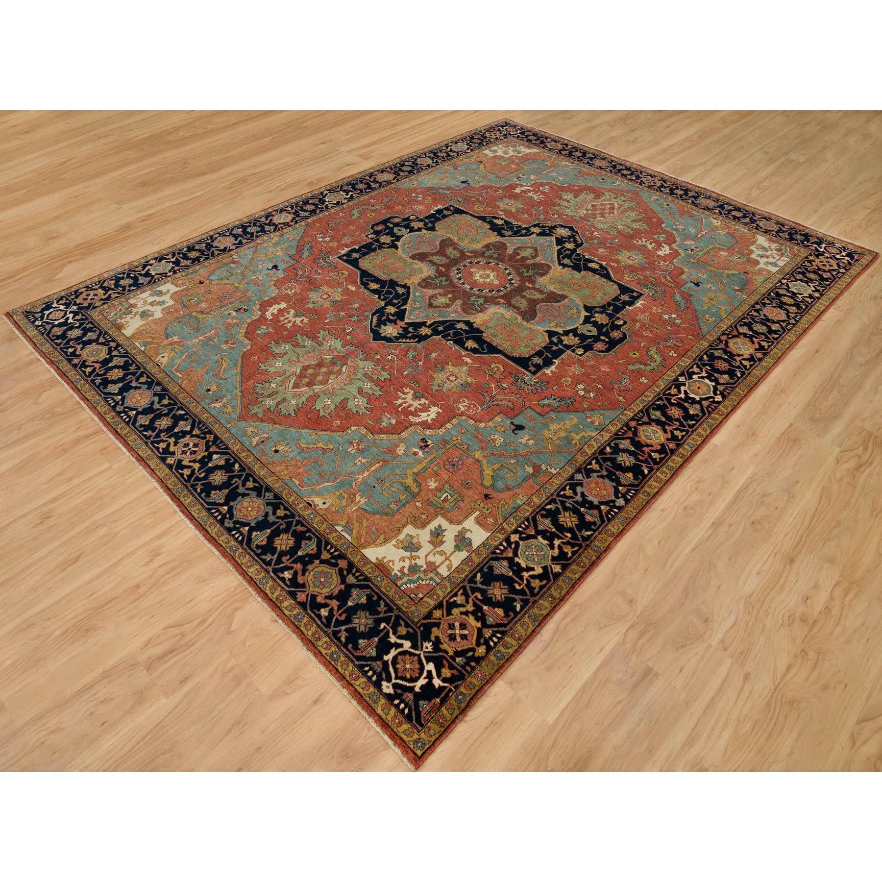 9’2″x12’1″ Midnight Red and Cadet Blue Corners, Soft and Lush Hand Knotted Natural Dyes Antiqued Fine Heriz Densely Woven Natural Wool Re-Creation, Oriental Rug Sh90295