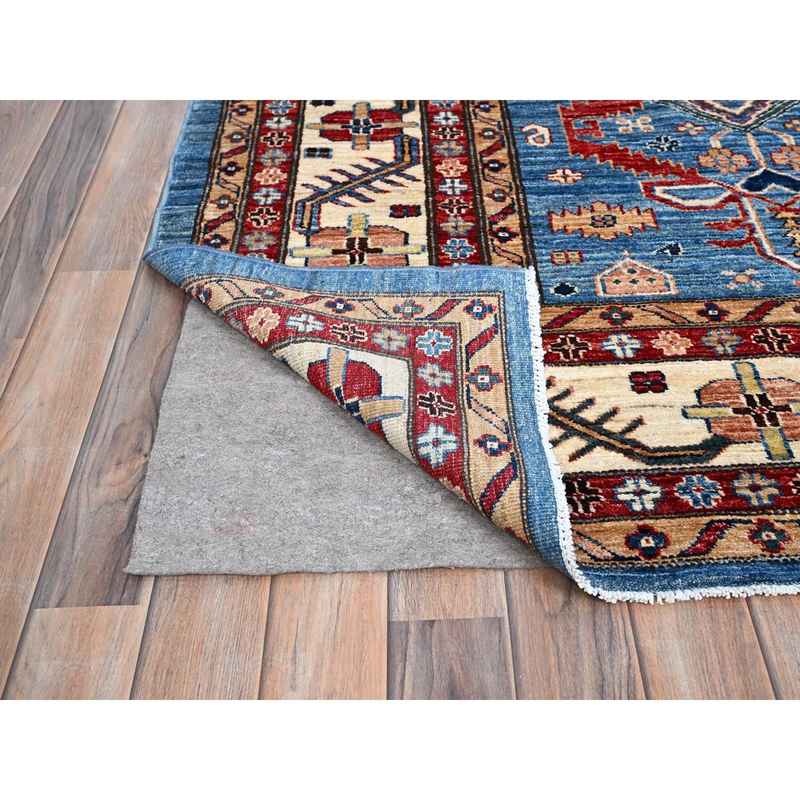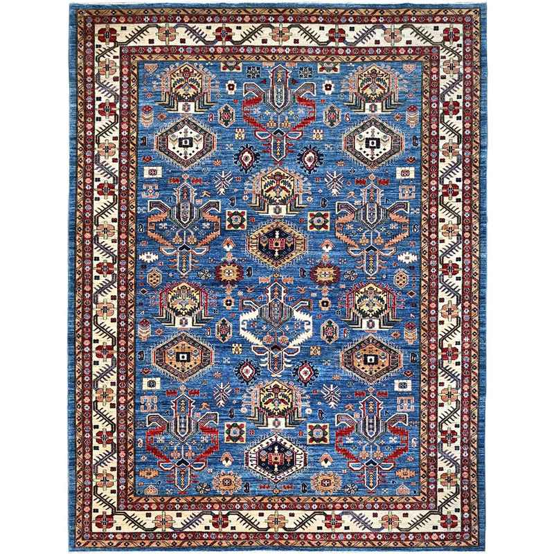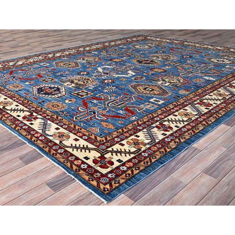 9’3″x11’10” Campanula Blue and Ballet White Border, Shiny and Vibrant Wool, Vegetable Dyes, Afghan Super Kazak with All Over Medallions, Hand Knotted, Denser Weave Oriental Rug Sh86533