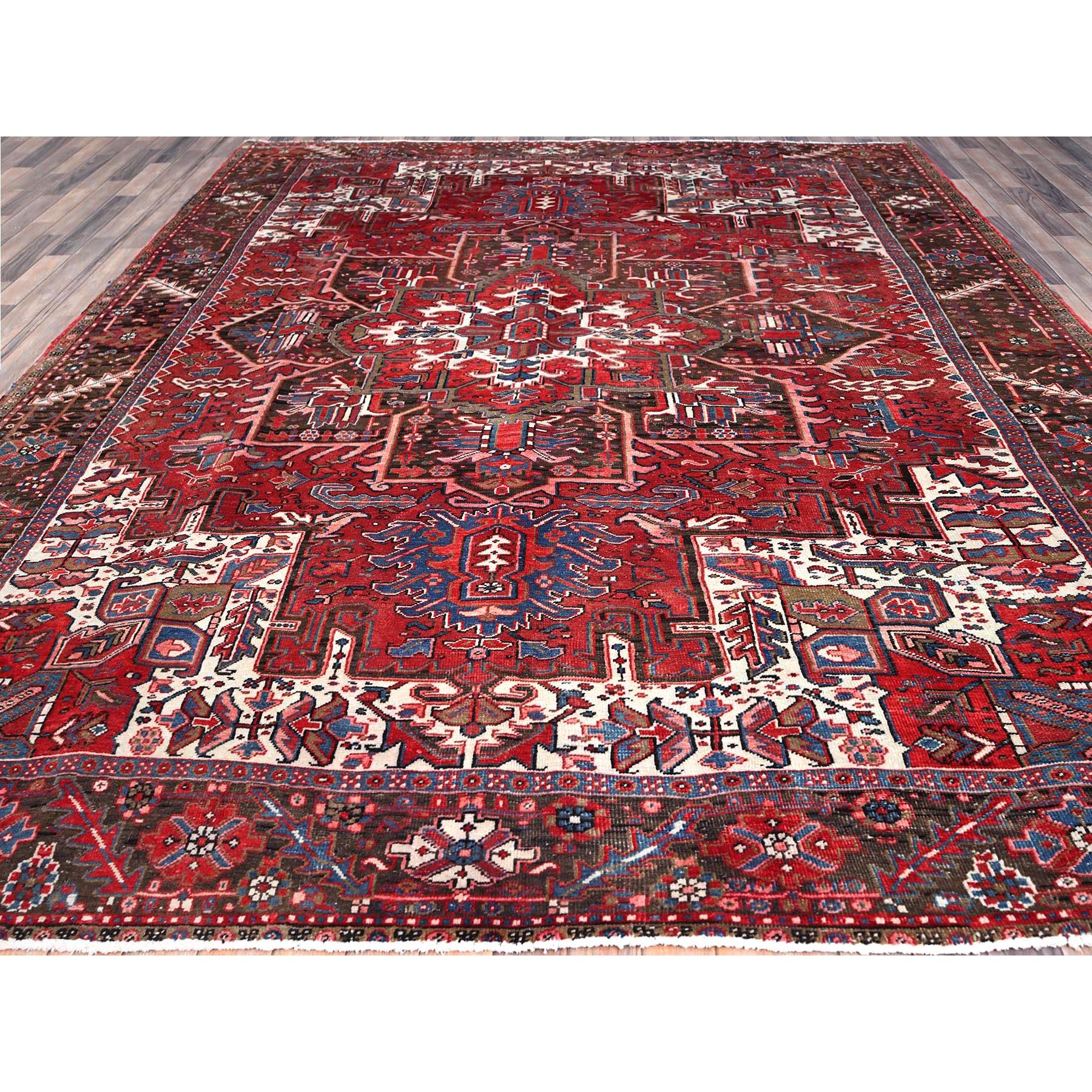 9’3″x11’8″ Currant Red, Semi Antique Persian Heriz Tribal Design, Lustrous Wool, Distressed, Hand Knotted Abrash, Sheared Low, Evenly Worn Oriental Rug Sh104