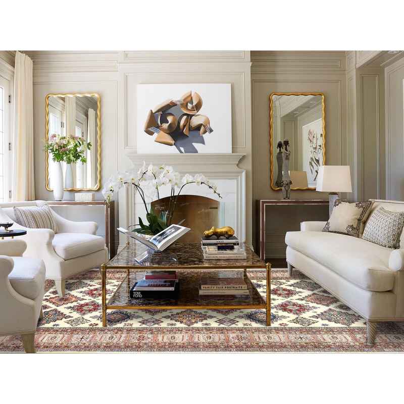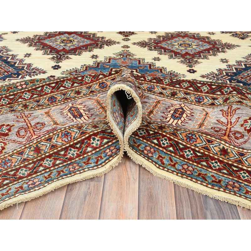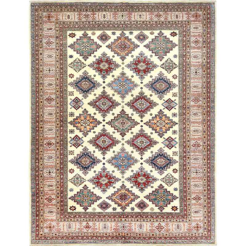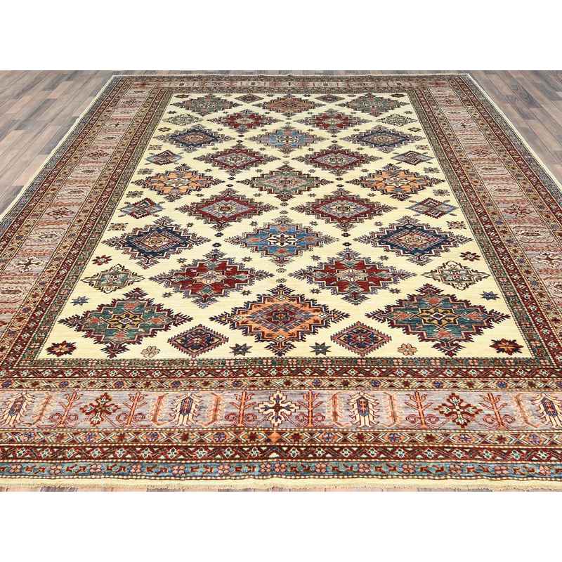 9’3″x12′ Ivory, Afghan Super Kazak with Geometric Medallions, Natural Dyes Densely Woven, Natural Wool Hand Knotted, Oriental Rug Sh82380