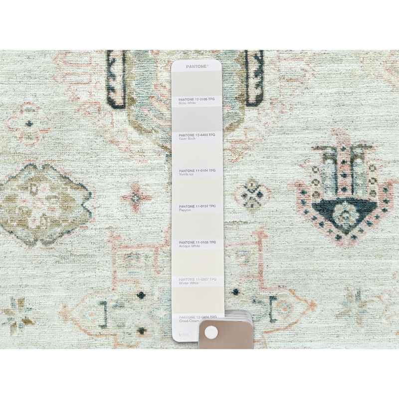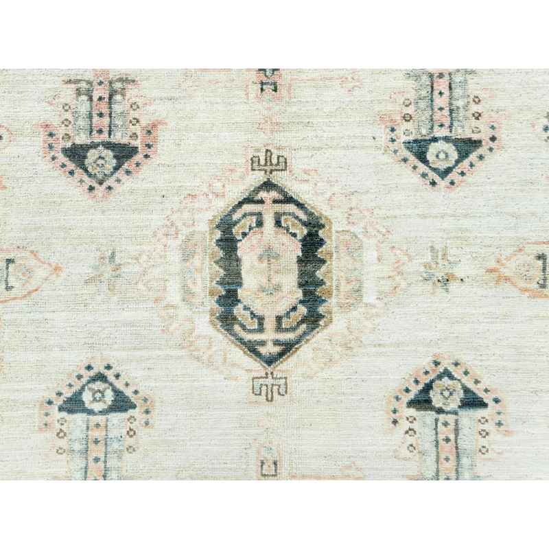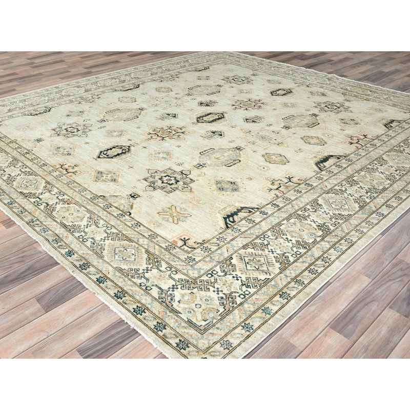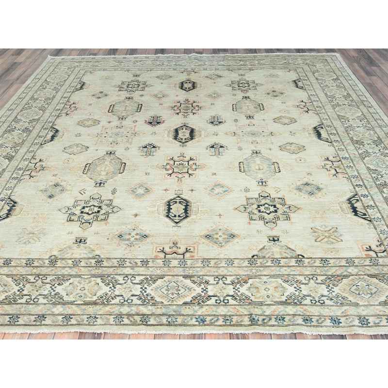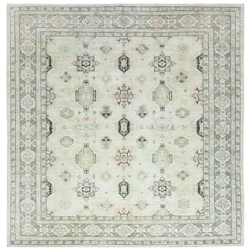 9’5″x9’8″ Cloud Gray, Afghan Super Kazak with Geometric Medallions Design, Natural Dyes, Dense Weave, Pure Wool, Hand Knotted, square, Oriental Rug,Sh85028