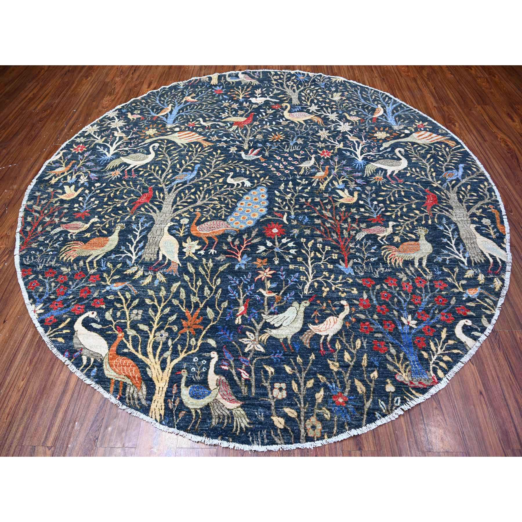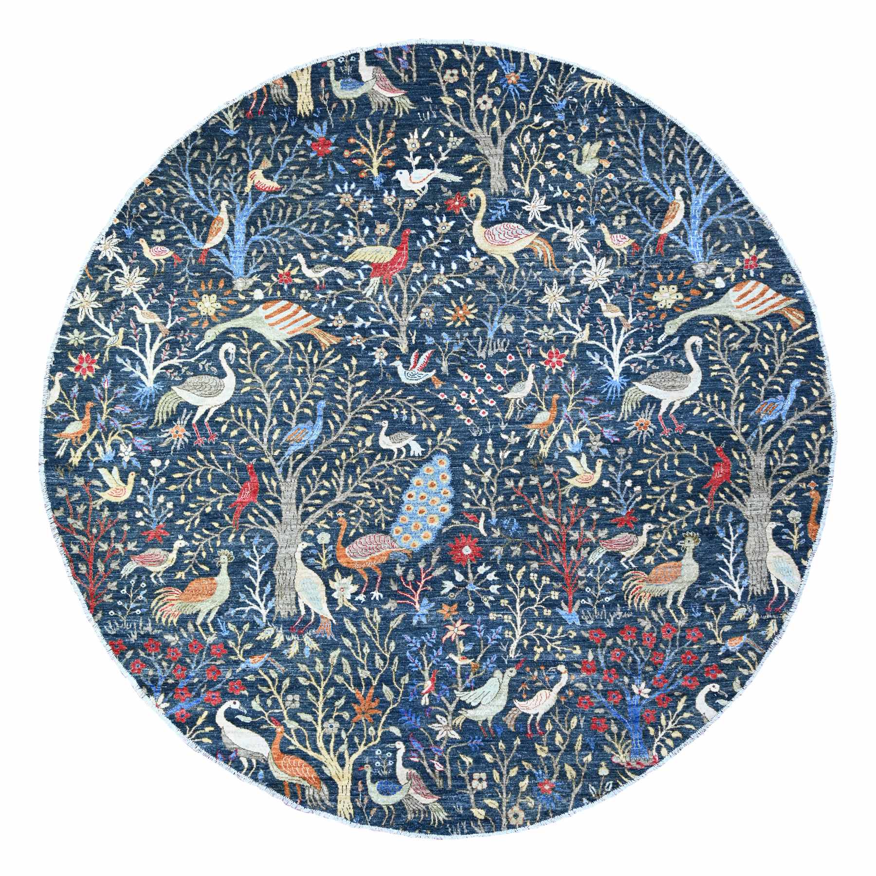 9’6″x9’6″ Yale Blue, Hand Knotted, Natural Dyes, Soft Wool, Afghan Peshawar with Birds of Paradise, Round, Oriental Rug Sh88401