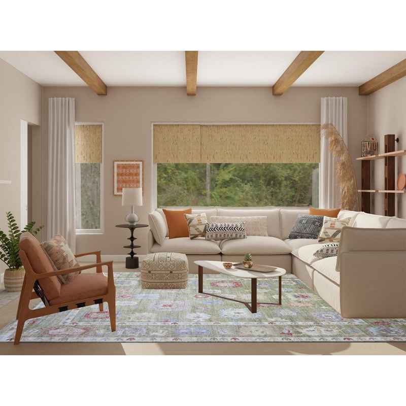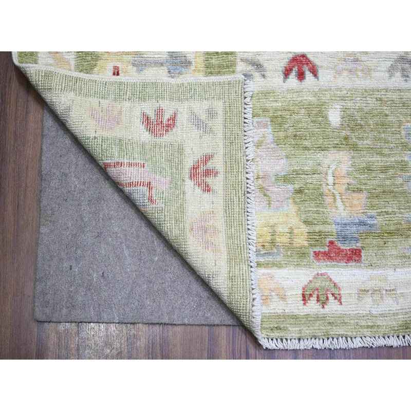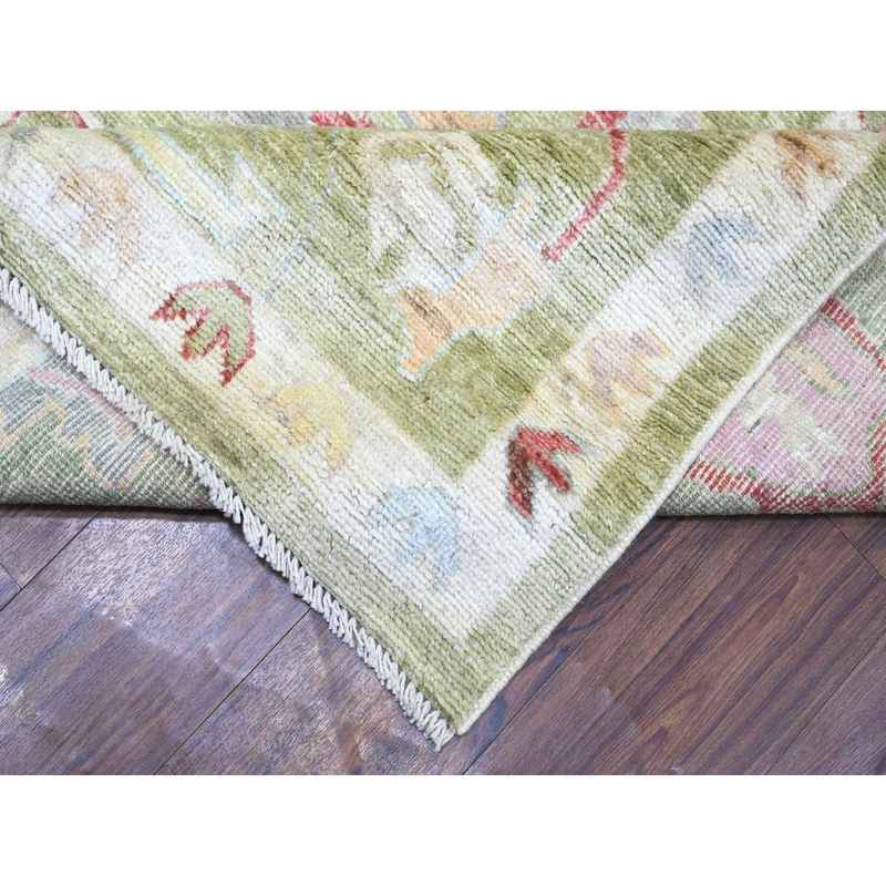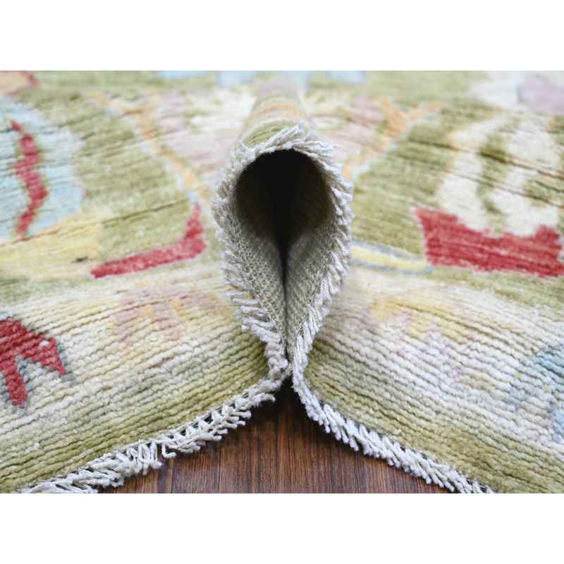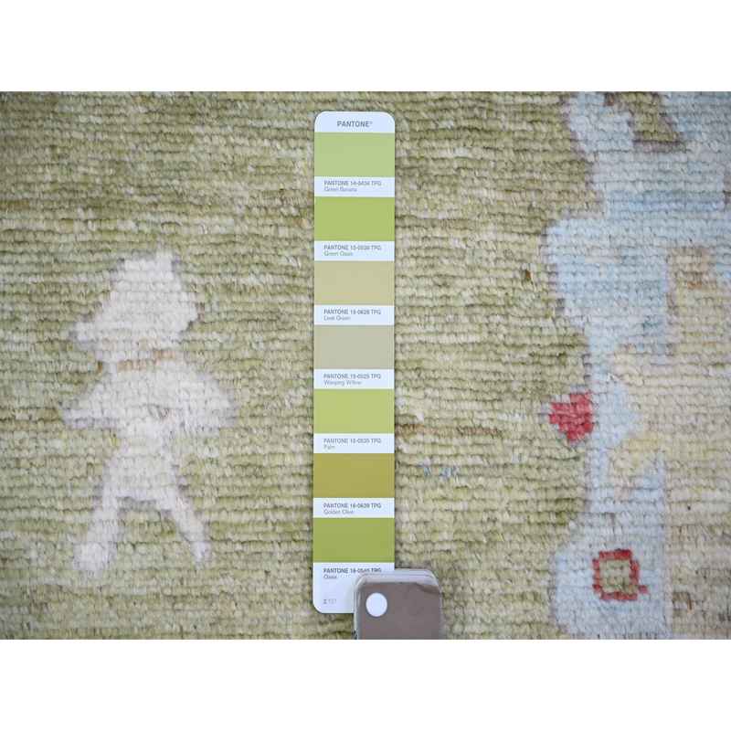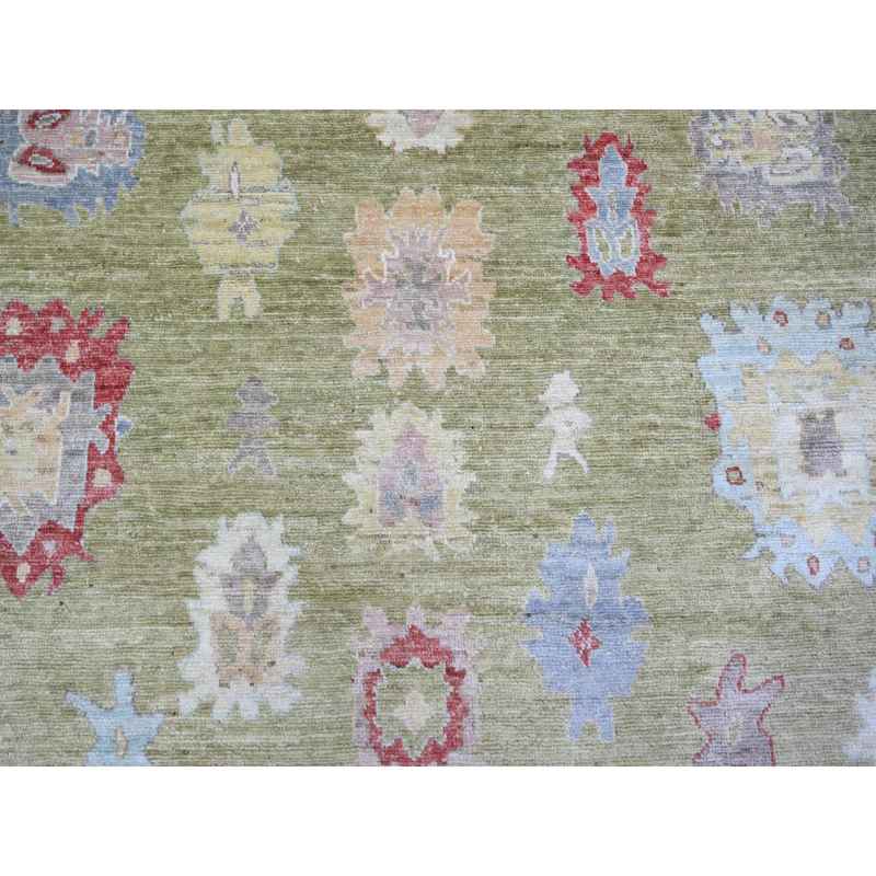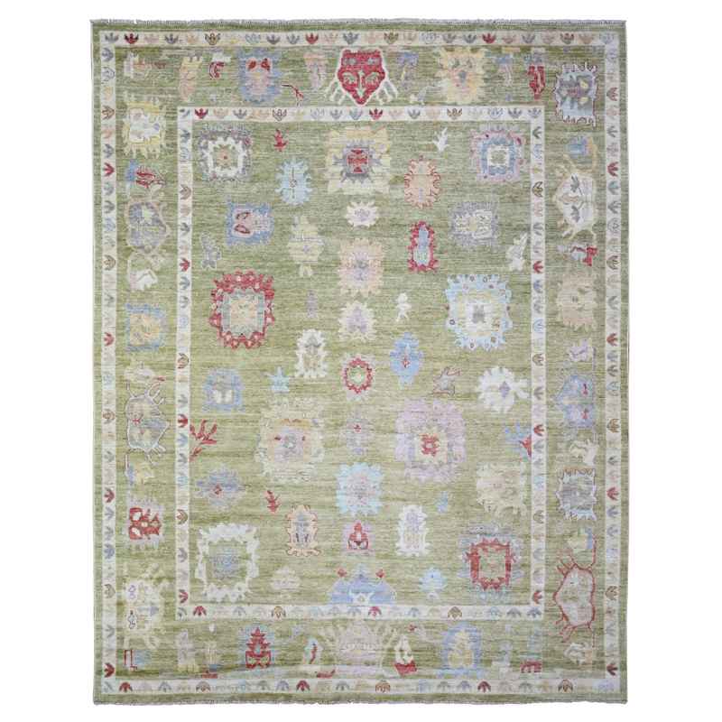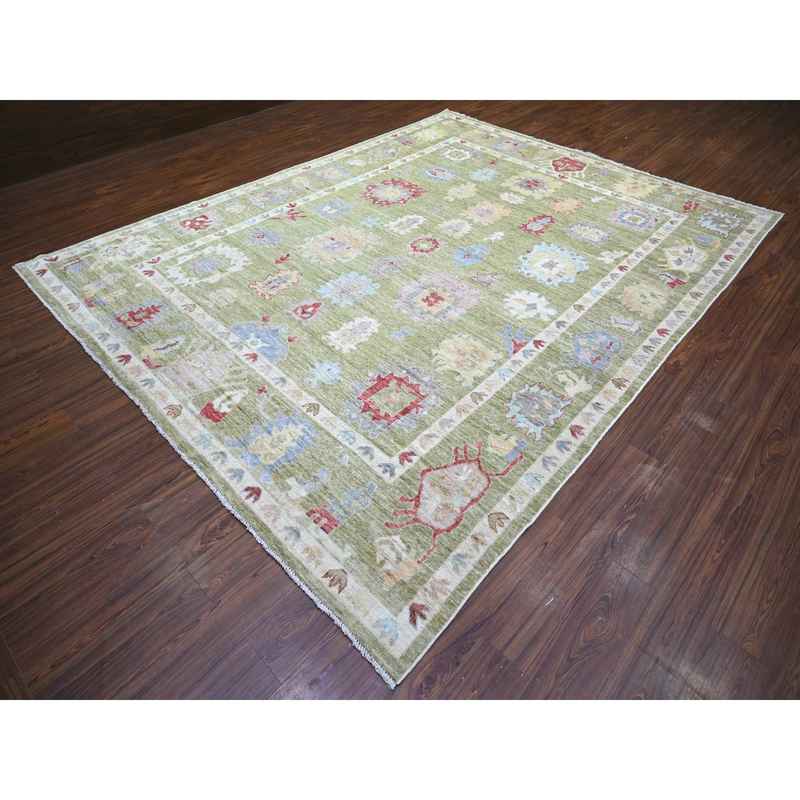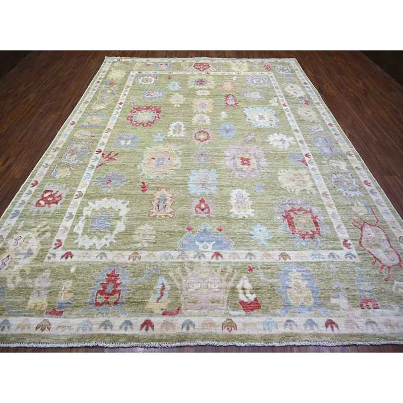 9’x11’6″ Golden Green, Pure Wool Hand Knotted, Afghan Angora Oushak with Colorful Motifs, Oriental Rug Sh73581