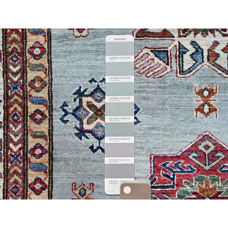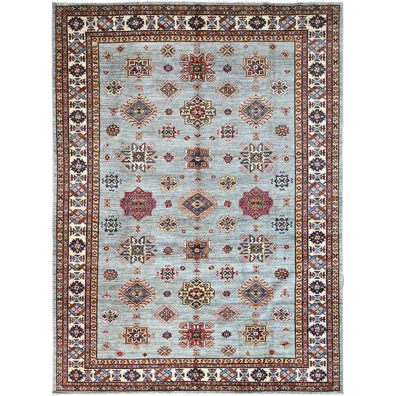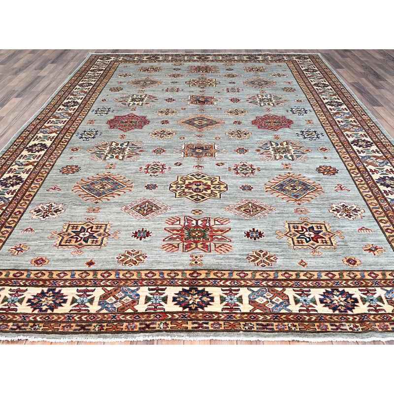 9’x12′ Puritan Gray, Cloud White Border, Hand Knotted Densely Woven, Afghan Super Kazak with All Over Geometric Motifs, Soft, Velvety Wool, Natural Dyes, Oriental Rug Sh86535