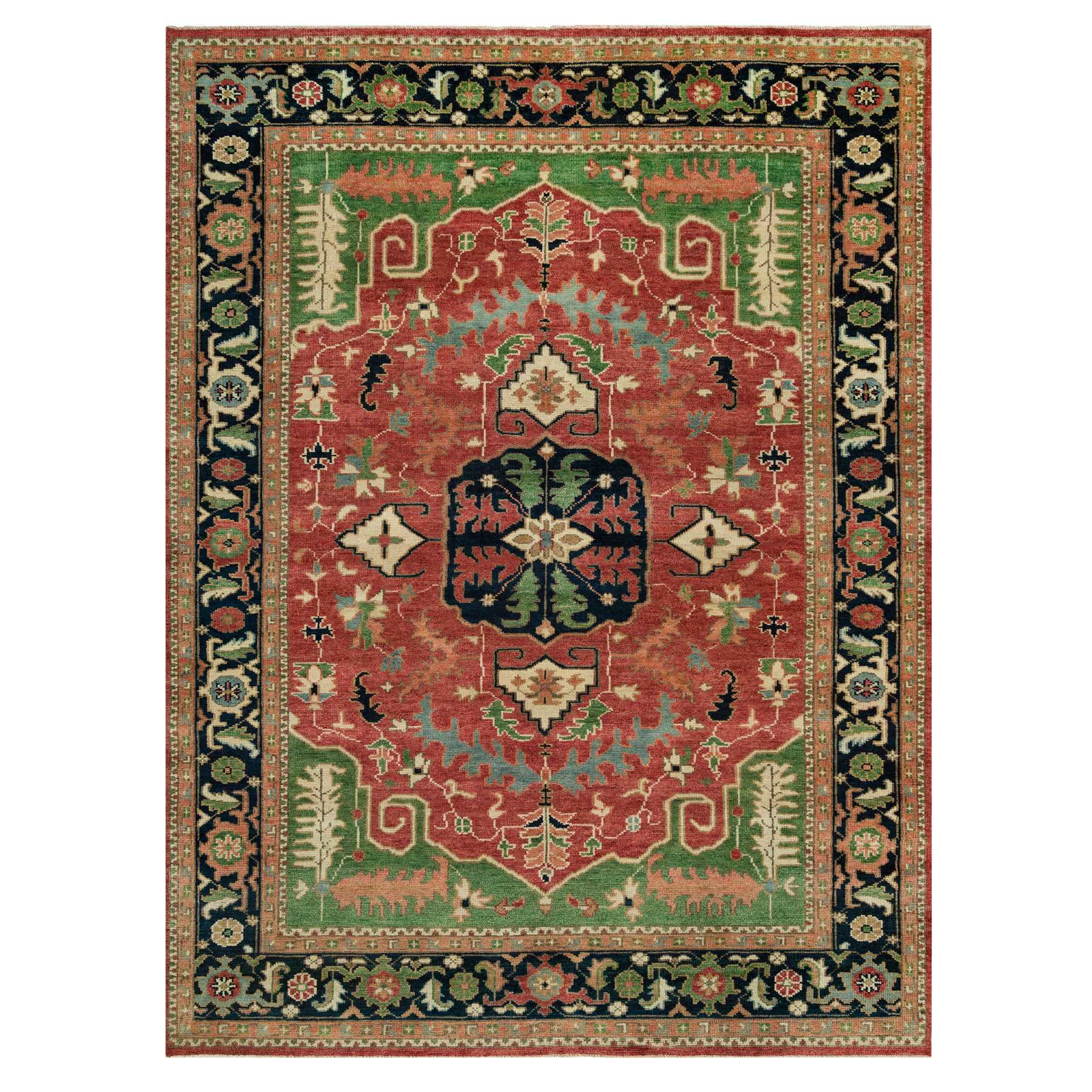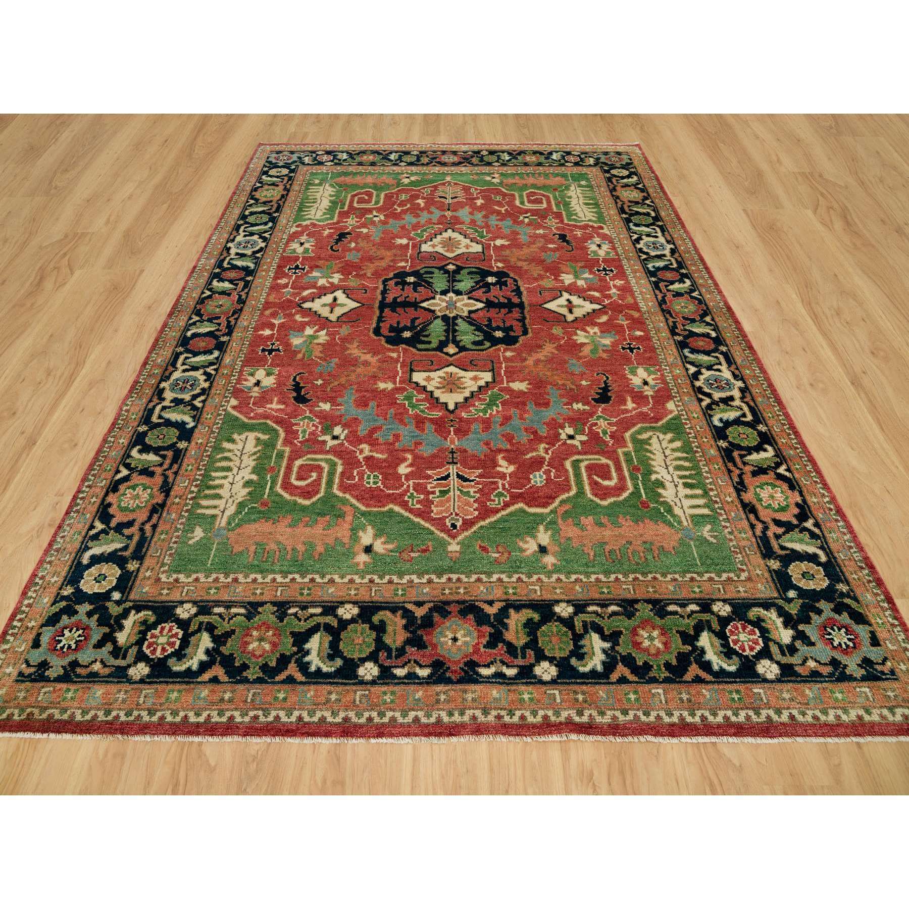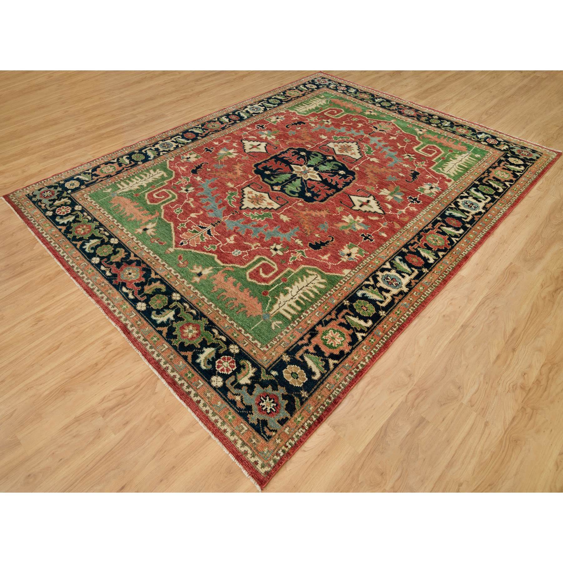 9’x12’2″ Flame Scarlet Red and Tottenham Navy Blue, Serapi Heriz Large Medallion Design, Pure Wool Hand-Knotted, Supple Collection, Thick and Plush, Oriental Rug Sh90286