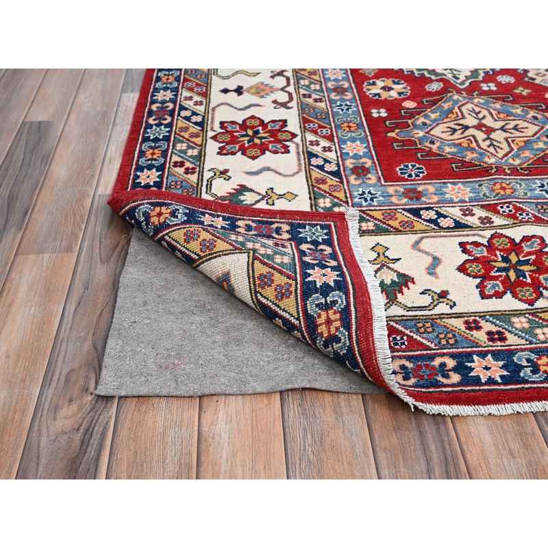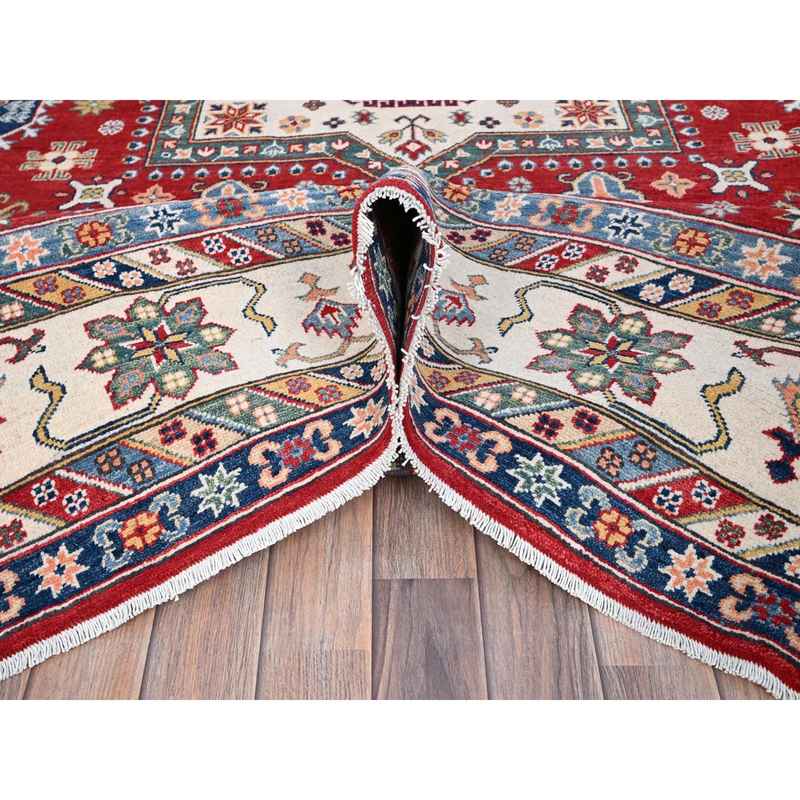 9’x12’4″ Rufous Red, Snowbound White Border, Kazak with Large Medallions, Vegetable Dyes, Soft Pure Wool, Hand Knotted, Oriental Rug Sh86801