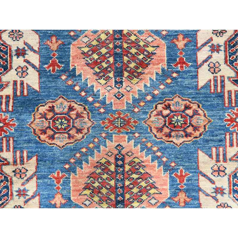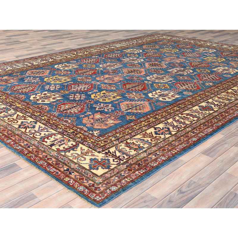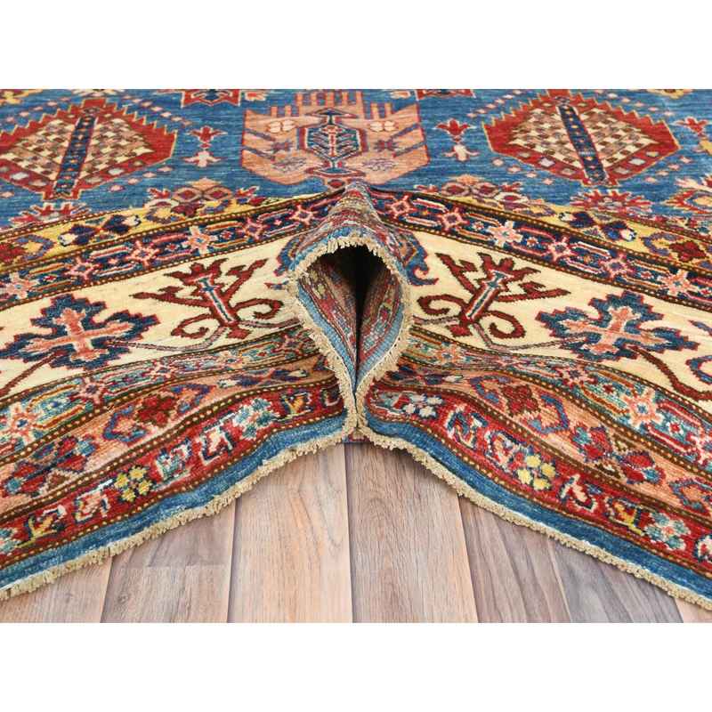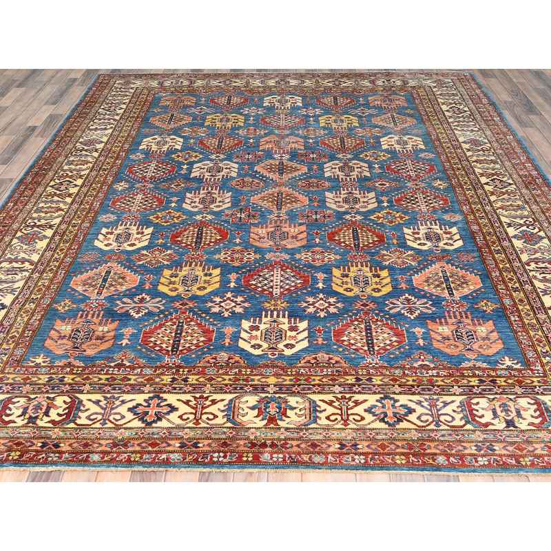 9’x12’7″ Denim Blue, Afghan Super Kazak with Floral Medallions, Vegetable Dyes Dense Weave, Soft Wool Hand Knotted, Oriental Rug Sh82447