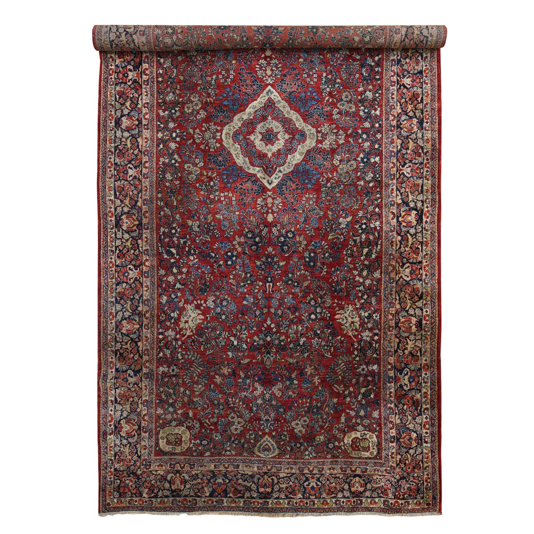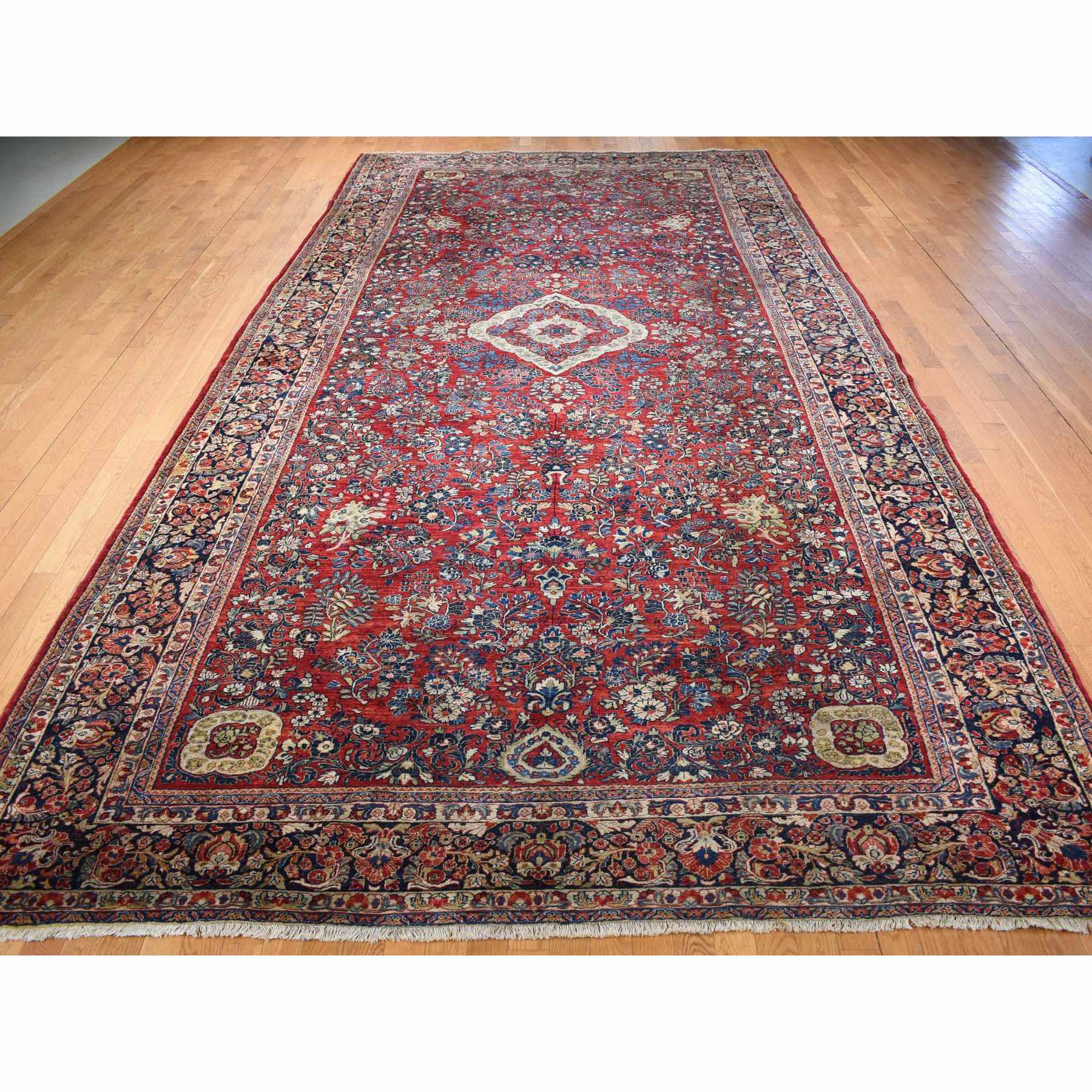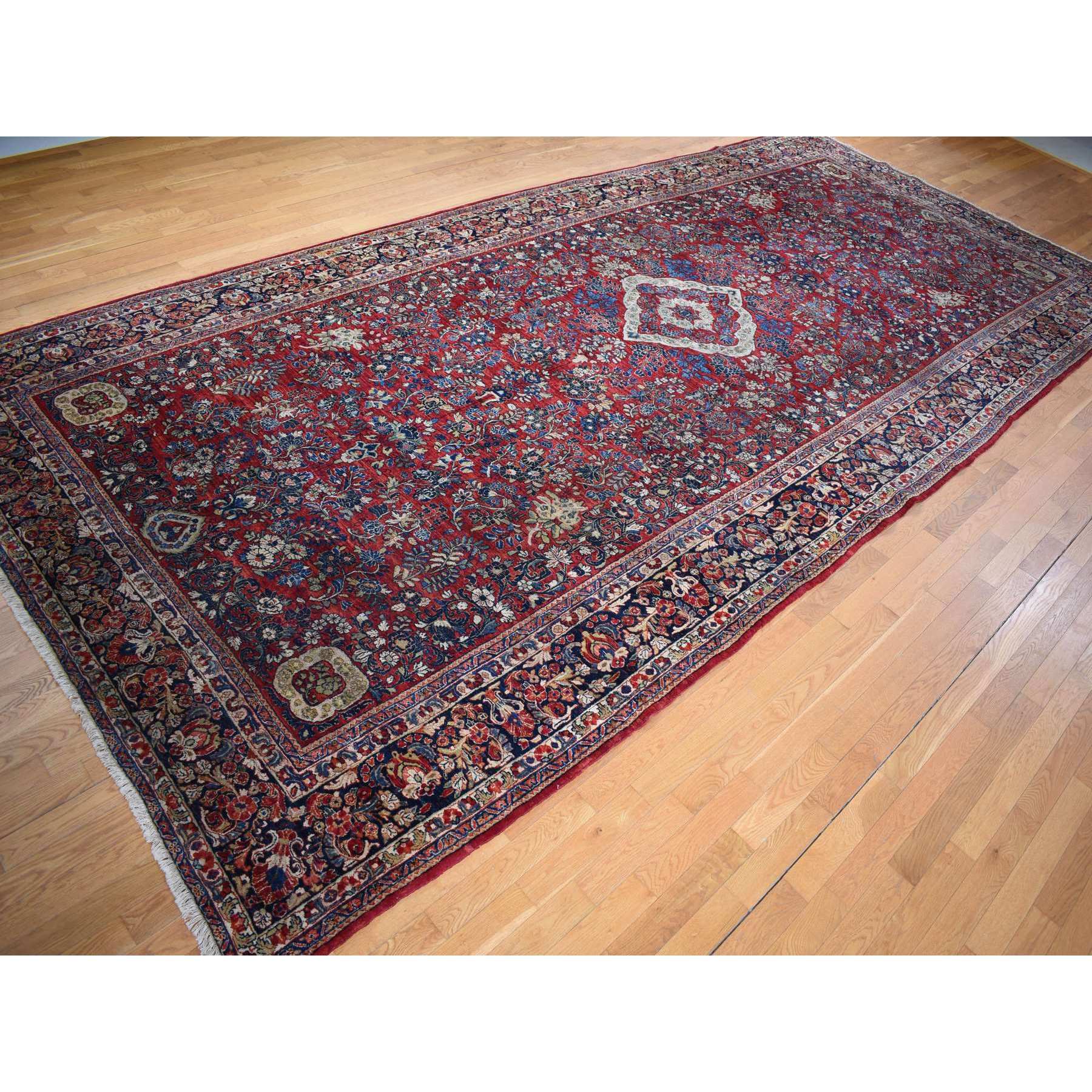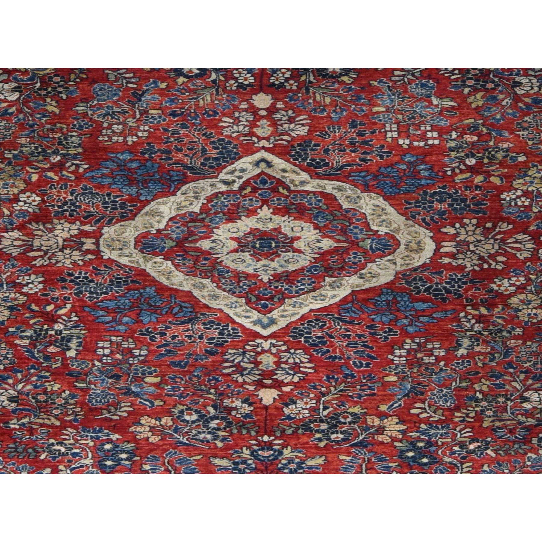 9’x19’4″ Barn Red With Colorful Border, Antique Persian Sarouk Flower Bouquet Design, Long And Narrow Rare Gallery Size, Full Pile, Clean and Soft, Sides and Ends Professionally Secured, Hand Knotted Natural Wool Oriental Rug Sh78173